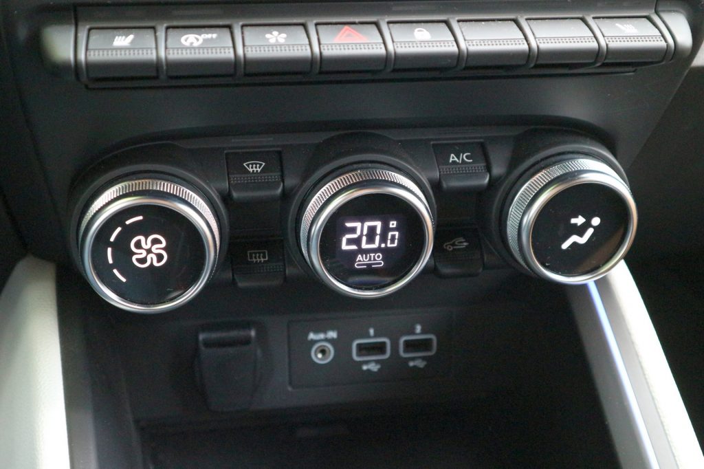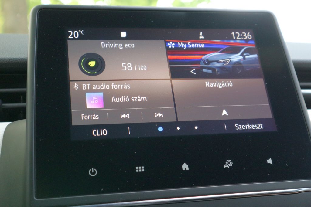 A klíma kezelése szerencsére a Clióban is teljesen elkülönül a menürendszertől, nem úgy, mint a másik két francia márka autóiban. A szabályzótárcsákba integrált kijelzők szépek és elegánsak, nem csoda: azok voltak már az Audiban is, ahol először láttunk ilyet. A kormány jó fogású, a kormánygombok elrendezésének logikája érthető, de a kormány mögötti infotainment-kezelő karocska továbbra is butácska és nehézkes megoldás, akkor is, ha új, szögletes dizájnt kapott az eszköz.
