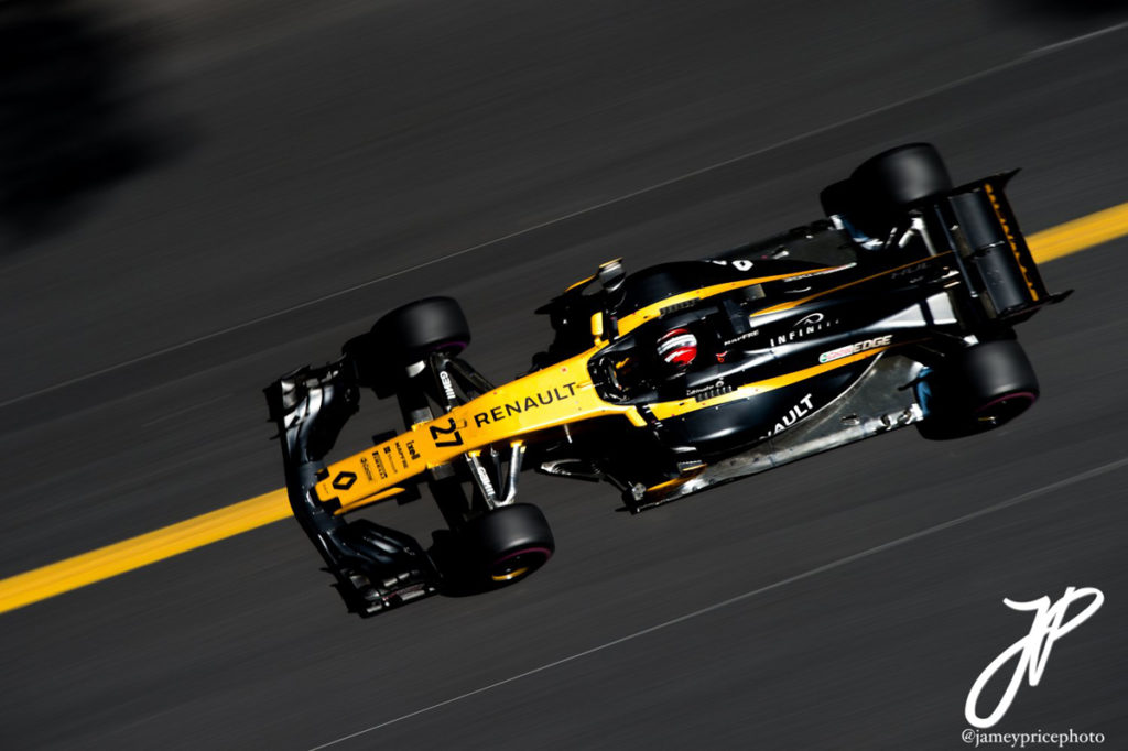 Nico Hülkenberg ezerrel tolja a sárga-fekete Renaultját a monacói pálya sárga útfestésű fekete aszfaltján: