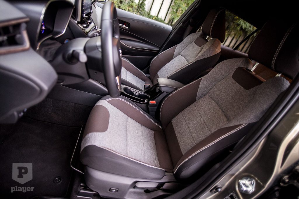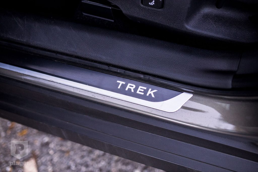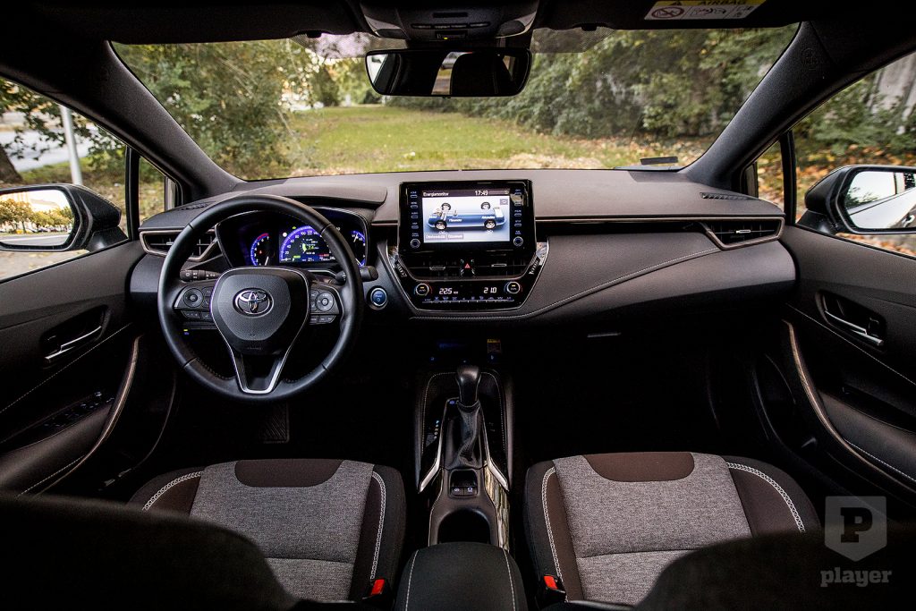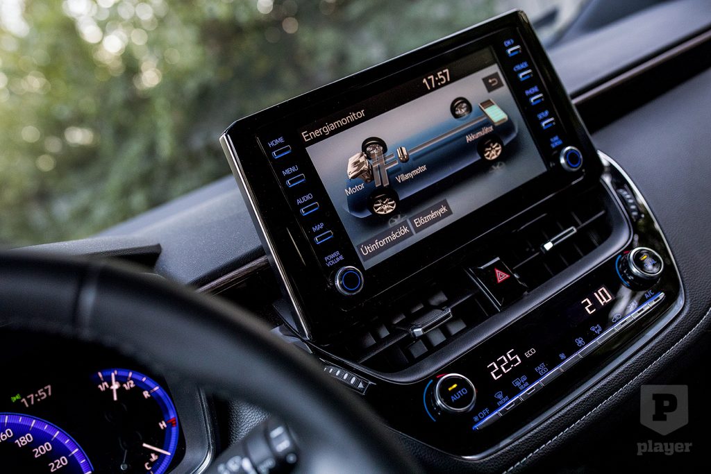 Corollás a beltér, legjellemzőbb eleme a nem felejtettünk el valami? basszus, a monitor! hatású érintőképernyő, szerencsére a klímavezérlés alatta kapott helyet külön gombokkal, áttekinthető és könnyen vezérelhető minden fedélzeti rendszer. Trek-specifikus viszont a rettenetes japán fautánzatokhoz képest egészen új szintet képviselő famintás dekor, és a szintén ízléses szürke-barna textilhuzat. Más Corollákban is jól mutatnának, de a Trekhez különösen illenek.