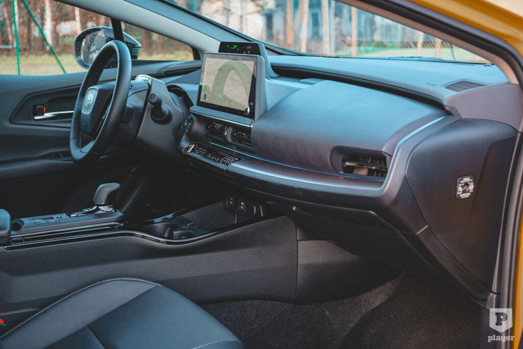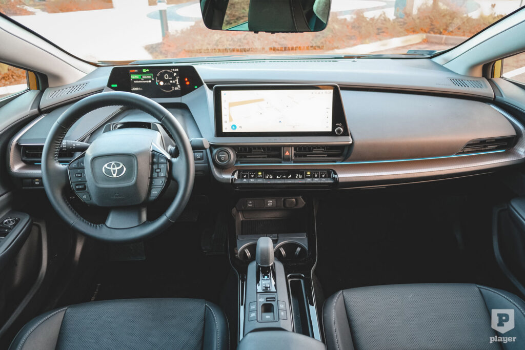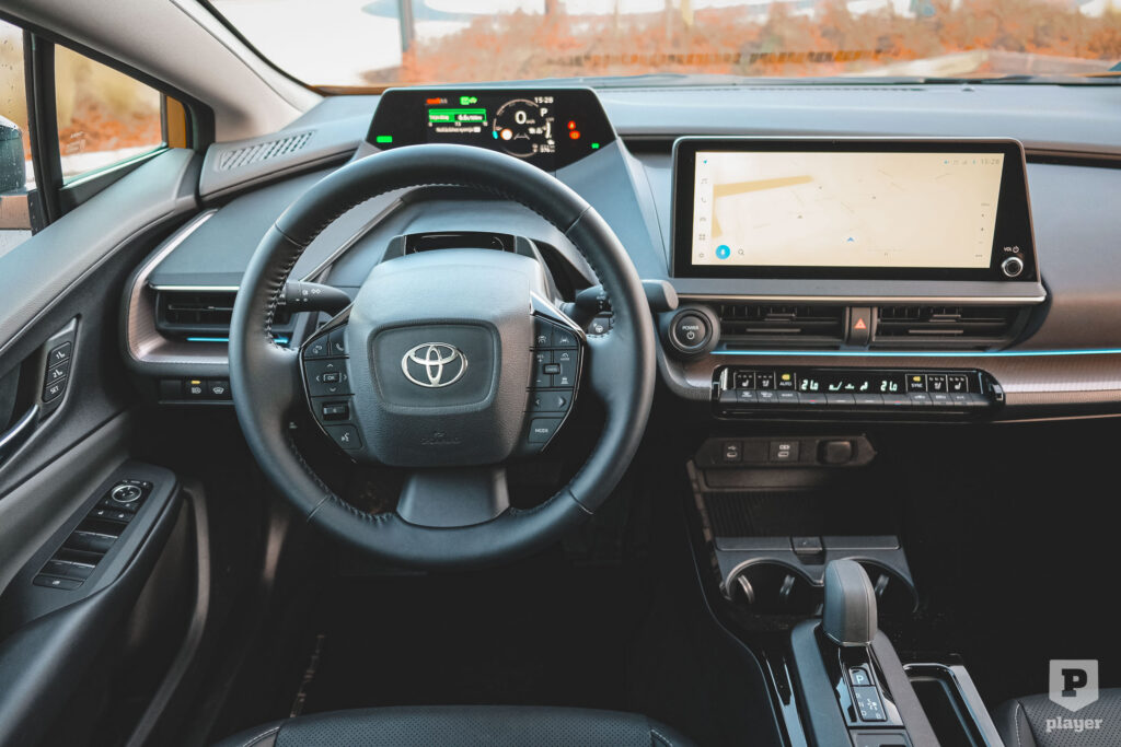 A műszeregység olyan, mint a Peugeot-nál az i-Cockpit, és pont olyan jól működik is a gyakorlatban. A kormánykarima fölé emelt kijelzőre könnyen, gyorsan le lehet pillantgatni, ezzel a nagyon egyszerű ergonómiai kialakítással a head-up displayt is meg lehetett spórolni; nem is hiányzik a Priusból a szélvédőre vetített kép.
