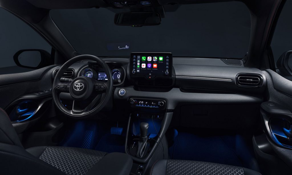 A műszerfala vadonatúj, a kormánykerék mögött három digitális kijelzővel, és középen a nagy érintőképernyővel, ami már okostelefon-tükrözésre is képes lesz. A Yaris újdonsága a szélvédőre vetítő head-up display, valamint