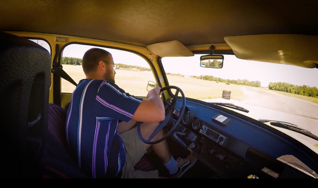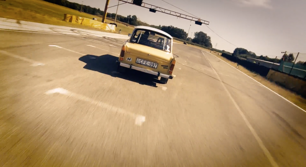 Összetéveszthetetlen motorhanggal indul a múlt évezred végére filterezett videó, ami már előre sejteti, hogy egy versenypályán ritkán látott gépet fog bemutatni; egy nyélgázon hajtott Trabant 601s-t.