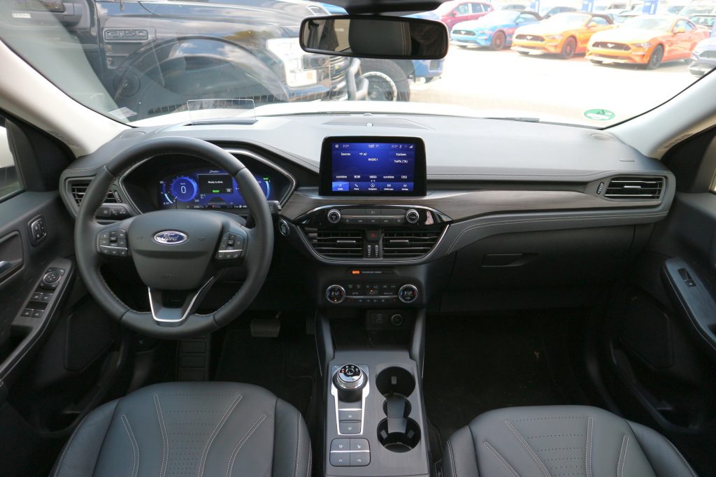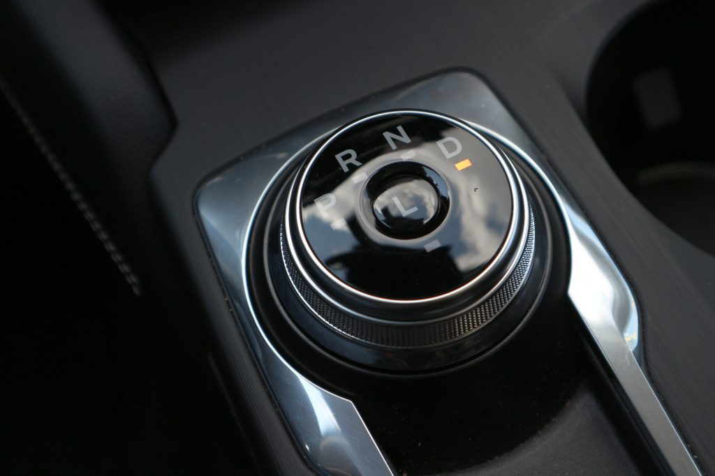 Érdekes, mondhatni merész döntés a Fordtól, hogy semmiféle kézi belenyúlkálást nem enged az erőátvitelbe. Van villanyautó, ahol a kormány mögötti kamu váltófülekkel a visszatöltés mértéke, a kvázi-motorfék álllítható, van fokozatmentes váltós autó, ahol előre beállított ál-fokozatokkal próbálnak klasszikus váltási élményt adni a sofőrnek, de a Ford nem ment bele ilyen játékokba. A váltótárcsán az előre-hátra-sehova állások mellett van egy L gomb, ami növelt nyomatékot produkál vontatás esetére (a hibrid Kugával 3,5 tonnás fékezett utánfutó is vontatható!), de ennyi.