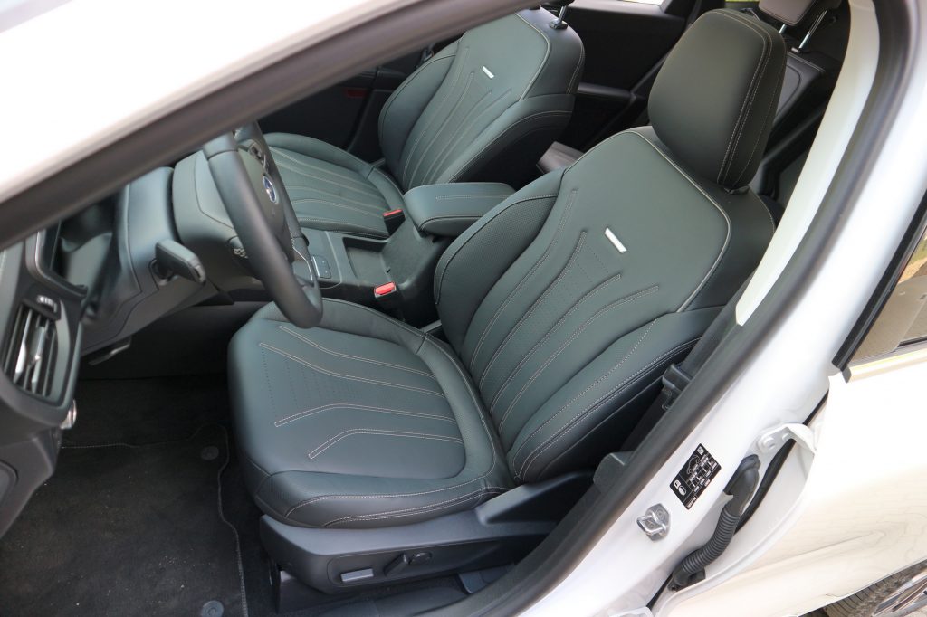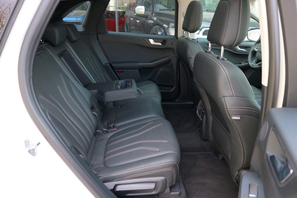 A kabinban legalább ilyen tanácstalanul fordultam körbe: tetszik ez vagy sem? A Vignale kivitel dacára nem érződött prémiumnak a berendezés, de ez pont így volt már a korábbi Kugában is. A mélypontot az ajtóbelsők jelentik: a nyomott gyémántminta a fullműanyag burkolólapon inkább szomorú, mint elegáns, a könyöklő a egyenes varrású picike bőrrel nem tudja ellensúlyozni a sivárságát. De a vizualitáson túli komfort, az ergonómia csaknem teljesen rendben van. Az ülések furán kicsik, de kényelmesek, ráadásul a csúcskivitelben nem bőrszerű a kárpit, hanem valódi bőr, aminek a tapintása, az illata is igazán lelkesítő (ha valaki nem vegán).