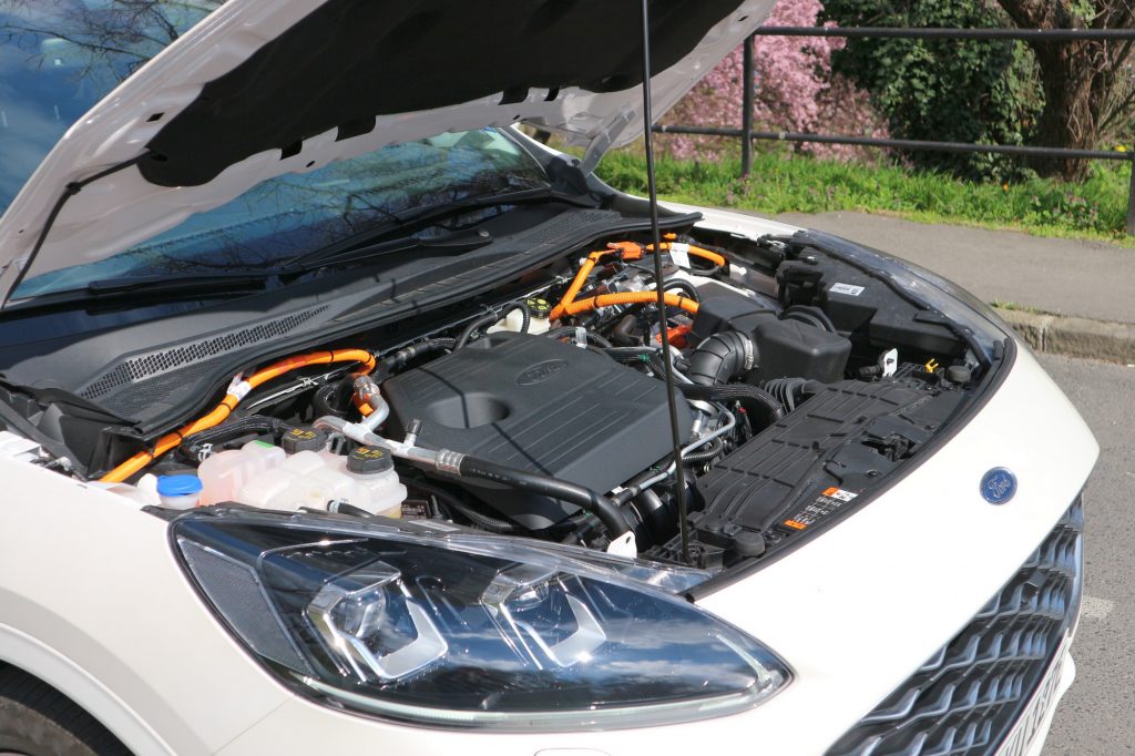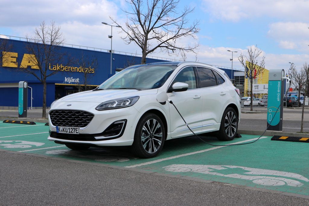 A Kuga lehetetlenül sokféle hajtáslánccal érkezik. Ez a mienk, a fehér egy Plug-In Hybrid, 2,5 literes, négyhengeres, Atkinson ciklusú (kis fordulatszám-tartmányban, de ott nagyon hatékony) szívó benzinmotorral és a vele egy tömbbe épített, az első kerekeket hajtó elektromos motorokkal, fokozatmentes, bolygóműves erőátvitellel. Szóval pont olyan, mint egy plug-in Prius. Az elektromos motor a csomagtér padlója alatti, 14,4 kWh-s lítium-akkuval önállóan is képes egész dinamikusan mozgatni a kocsit. WLTP-szabvány szerint tisztán elektromos üzemben 56 kilométert tud megtenni a kocsi, de ez városi-elővárosi üzemben, autópályázás nélkül még több is lehet! A plug-in hibrid Kuga rendszerteljesítménye 225 lóerő, ebből 108 lóerőt ad a villanymotor.