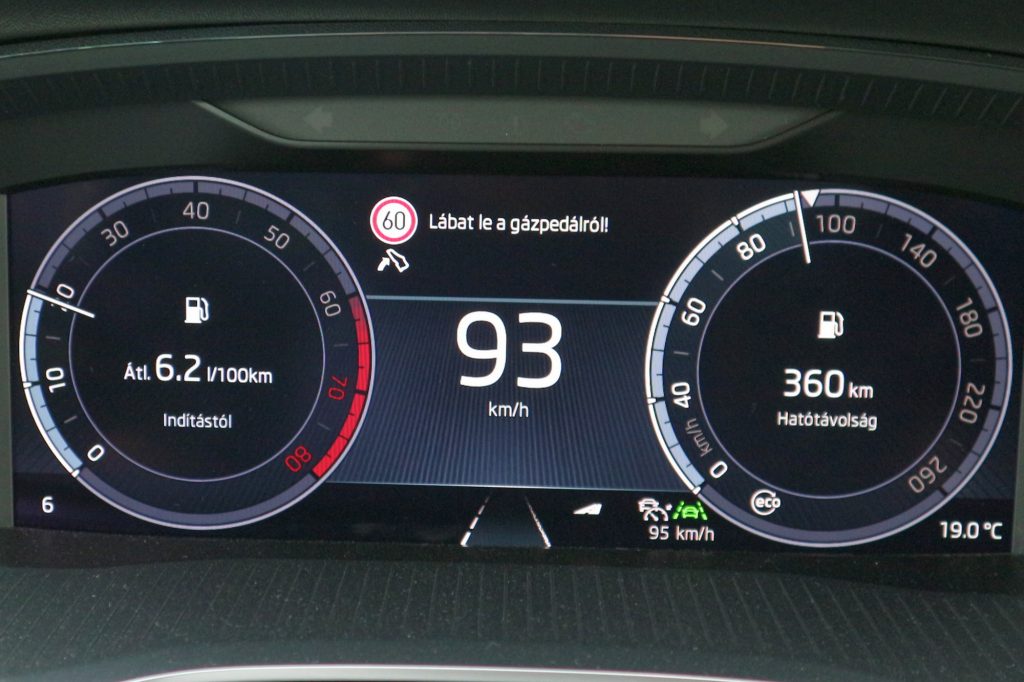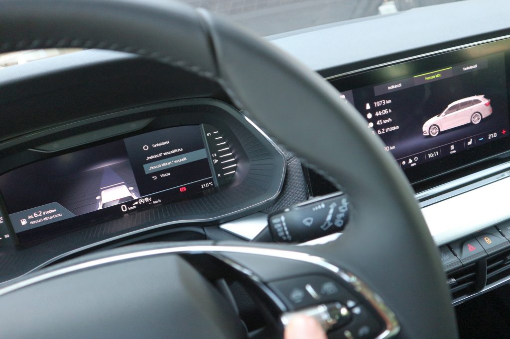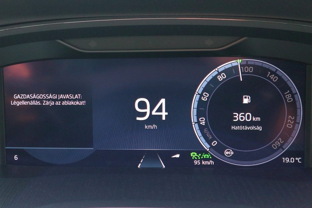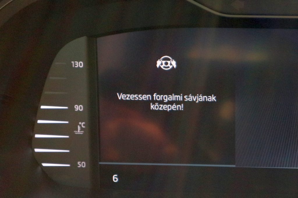 Az importőr valószínűleg pont a tízmilliós lélektani határ alatt maradás miatt spórolta ki az automata váltót, ami nagy hiba volt, mert ezt az agyonszabályzott Euro-6-zs-s motort kézi váltóval rém kellemetlen vezetni. A látványos virtuális műszeregység félkarú óriás Head-Up Display nélkül, nagyon kéne egy mindentől független, fix sebességkijelzés a mozi mellé. (Arról nem is szólva, hogy Octavia-szinten a HUD nagyon új és izgalmas dolog, szívesen megnéztük volna.) Az esetlenül magyarra fordított rendszerüzenetekkel folyamatosan beszólogató elektronika se szerettette meg magát igazán.