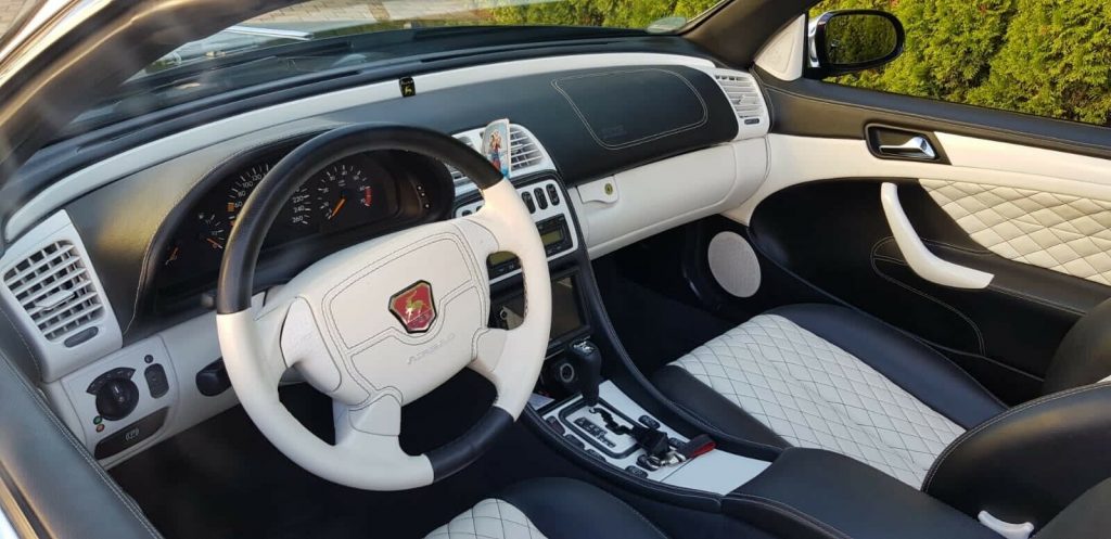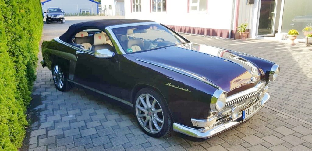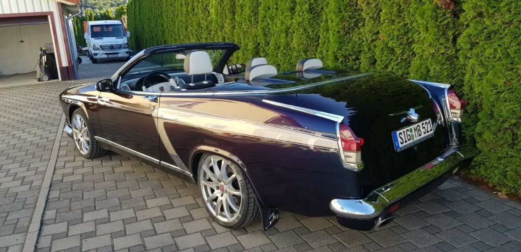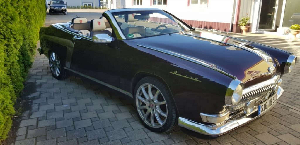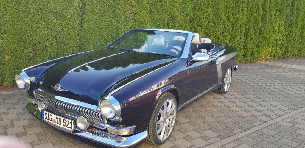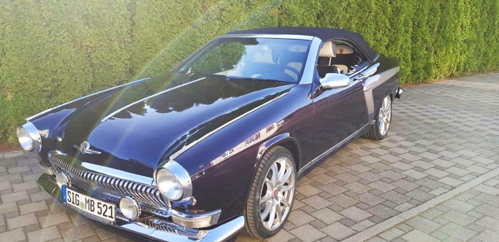 Most is egy ilyen kocsit árulnak Németországban: egy 1999-es Mercedes-Benz CLK 320-as az alap – erről árulkodik a műszerfal –, minden bizonnyal nagy, és a képek alapján egész gondos munkával lett belőle egy klasszikus Volgára hajazó, amúgy sosemvolt, egyedi autó.