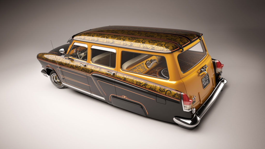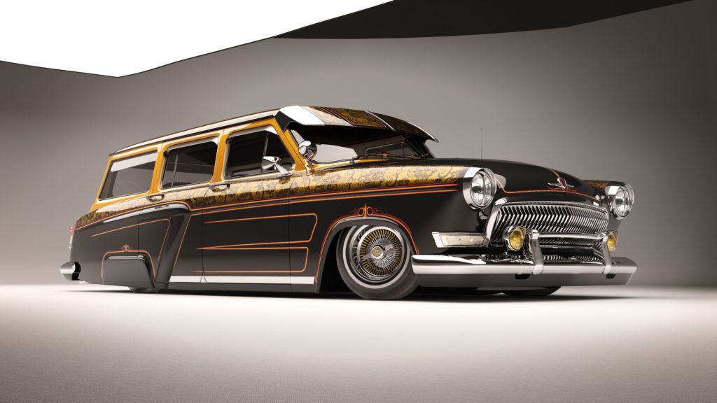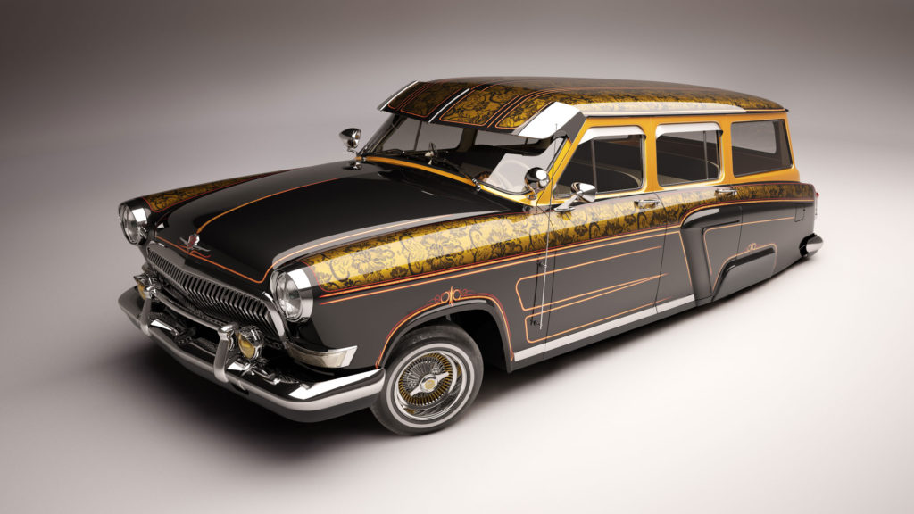 Ezért egyedi lowriderré módosította egy ügyes grafikus, lefedte a hátsó kerékjáratokat, majd oroszos elemekkel dobta fel a karosszériát. Hívei vagyunk az eredeti állapotban megőrzött veteránoknak, de talán egy kevésbé szép M22-est a valóságban is át lehetne így dolgozni…