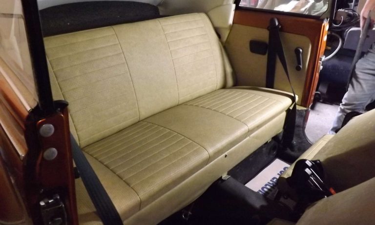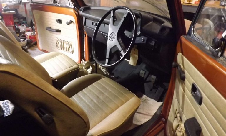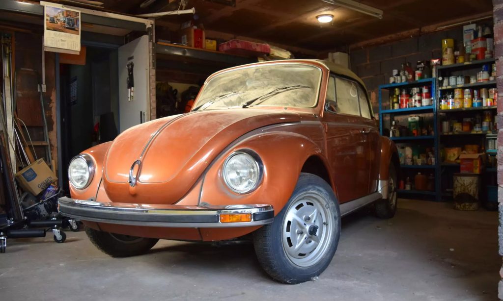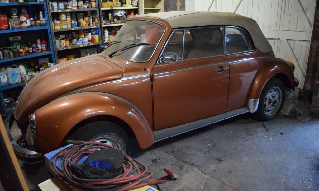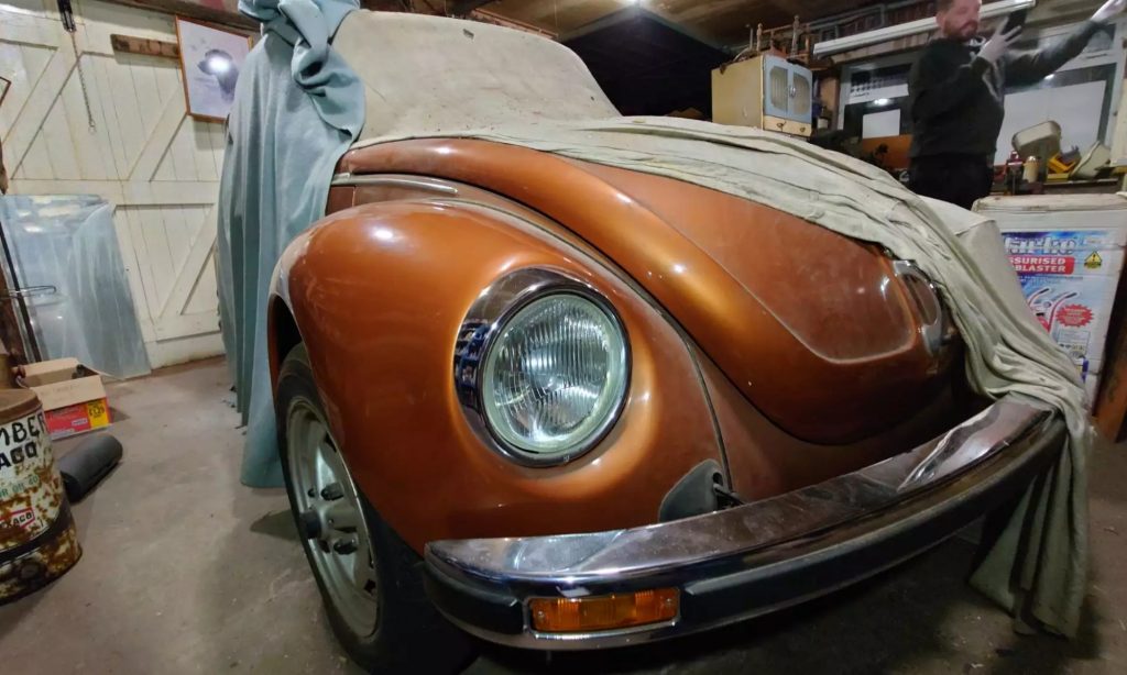 Ponyvával volt letakarva és garázsban állt, de bő negyven év alatt már ezeken a rétegeken is átette magát a por. A hosszú idő után felfedezett Volkswagen Bogár kabrió aranybarna fényezése azonban kifogástalan, ahogyan a bézs kárpitozású utastér is olyan lesz egy alapos takarítás után, mintha új volna.