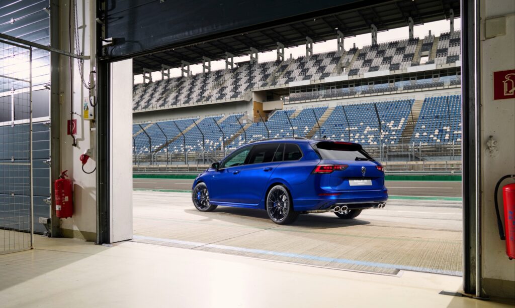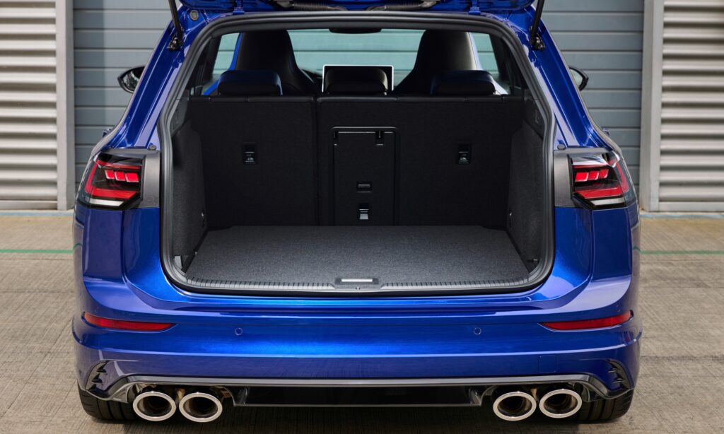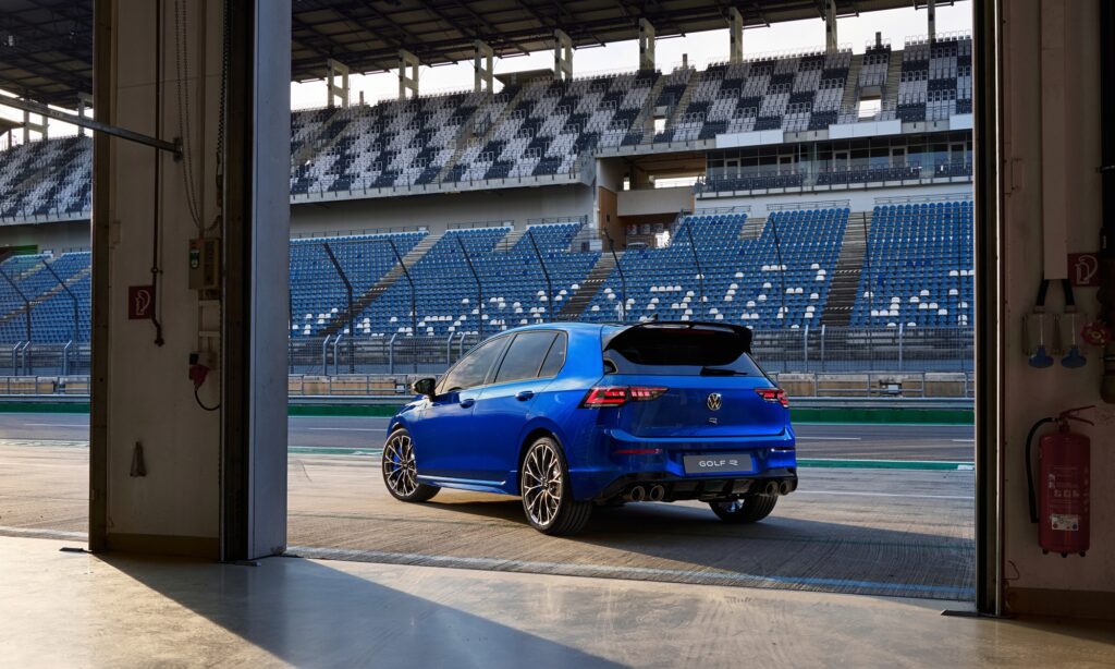 Kékre fényezett féknyergei, hatalmas légbeömlői, nagy hátsó szárnya és négy kipufogója van a Golf R-nek.