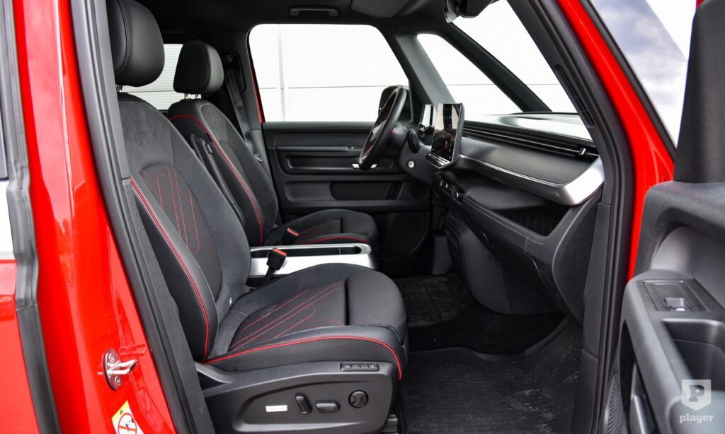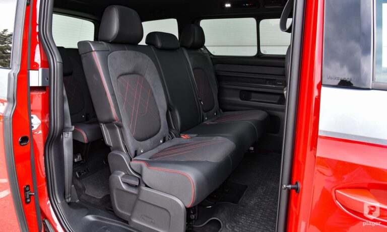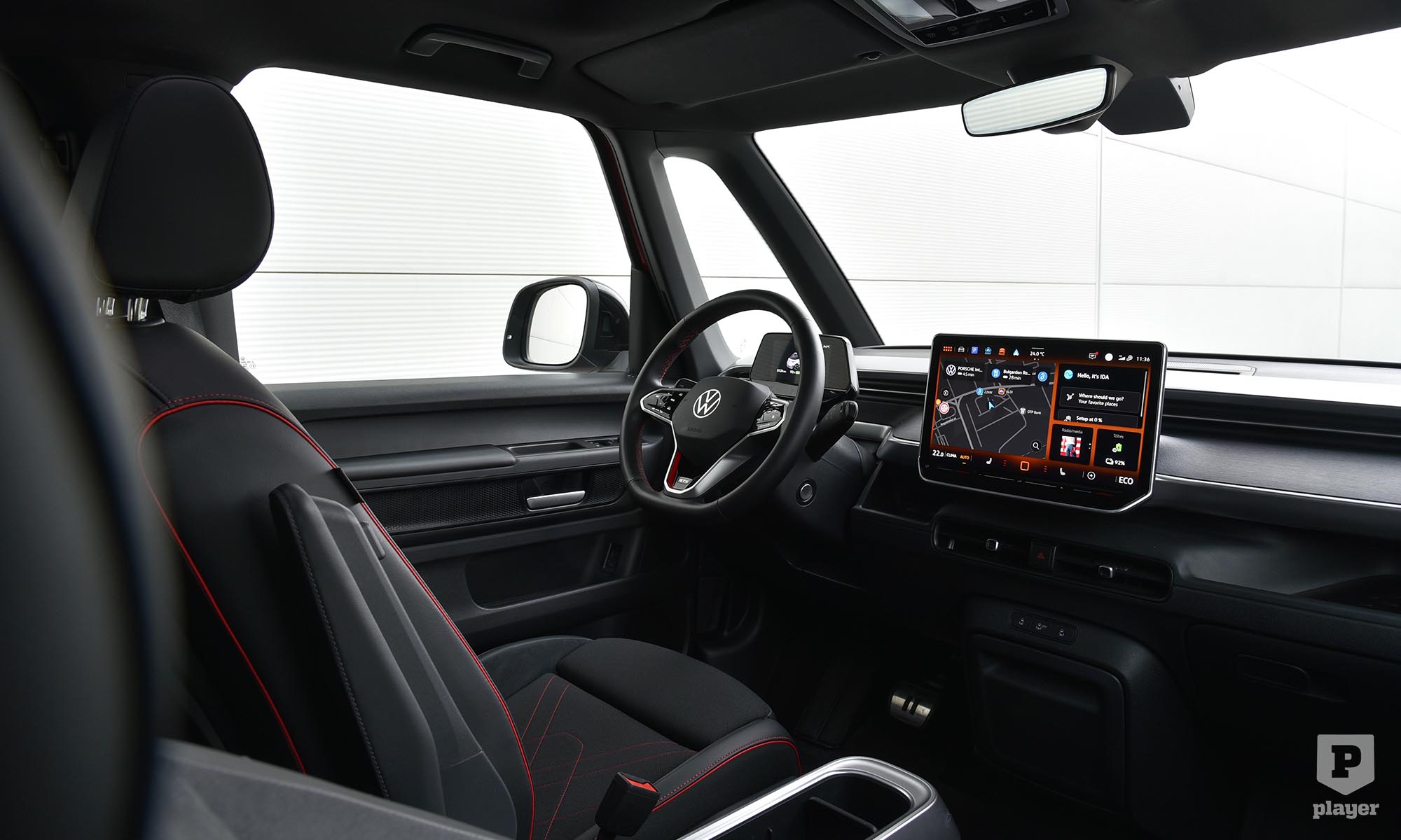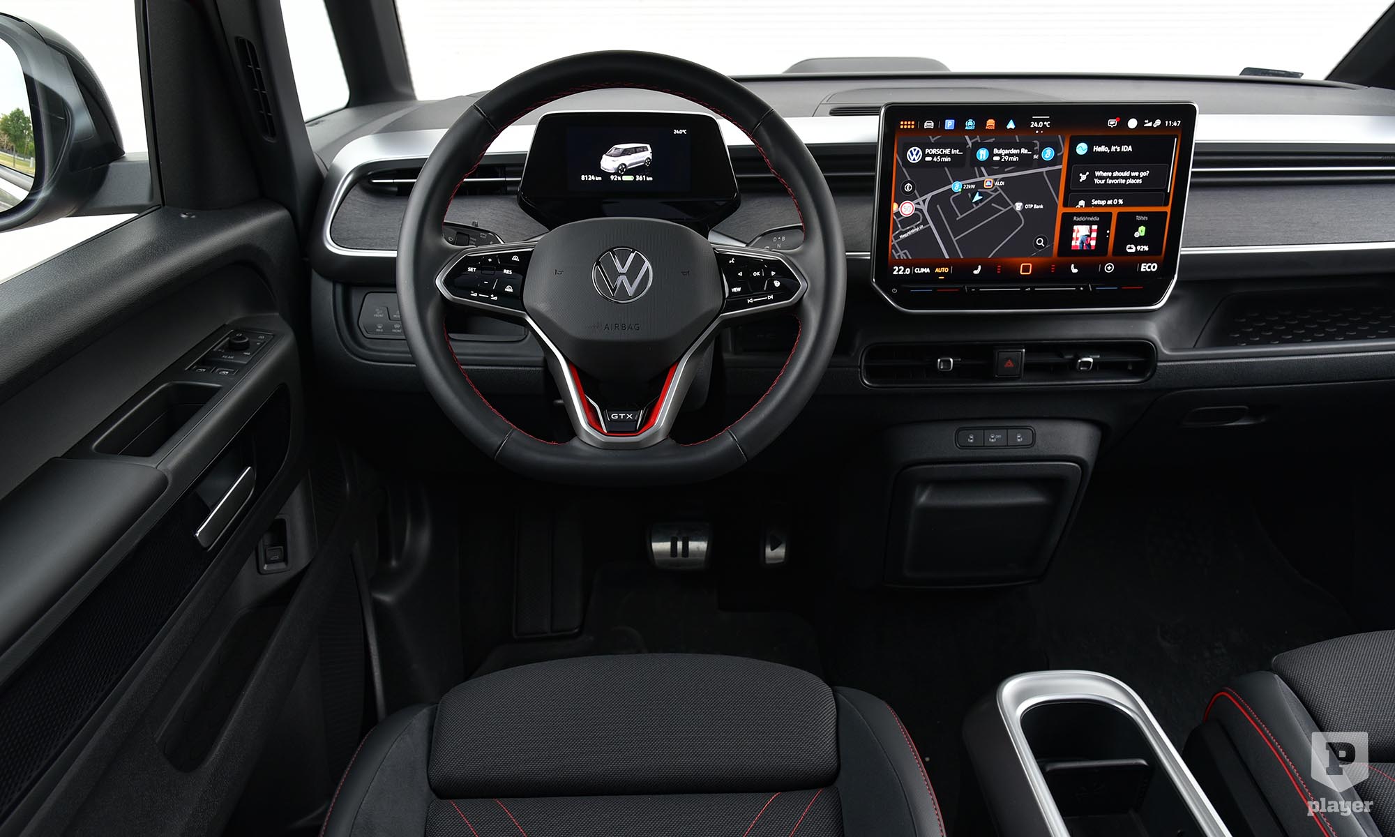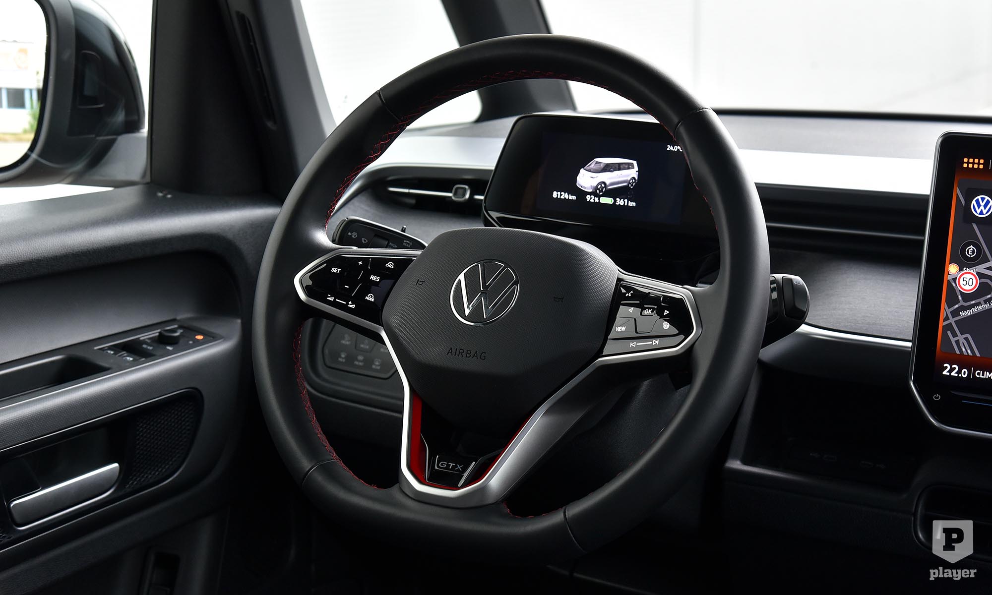 Nem sokat változott a belső tér sem, ahol a GTX mintájú ülések és a GTX emblémás kormánykerék mellett a piros cérnával varrt kárpitok tűnhetnek fel. Nem olyan vidám, mint a korábban látott ID. Buzz világos belsője, de sötét tónusával is kimondottan kellemes hely a Volkswagen kisbuszának belseje. Még akkor is, ha a haszonjárművekből ismerős kemény anyagok és a hangosan nyikorogva nyíló ajtók nem feltétlenül illenek az autó 30 millió forintról induló árához.