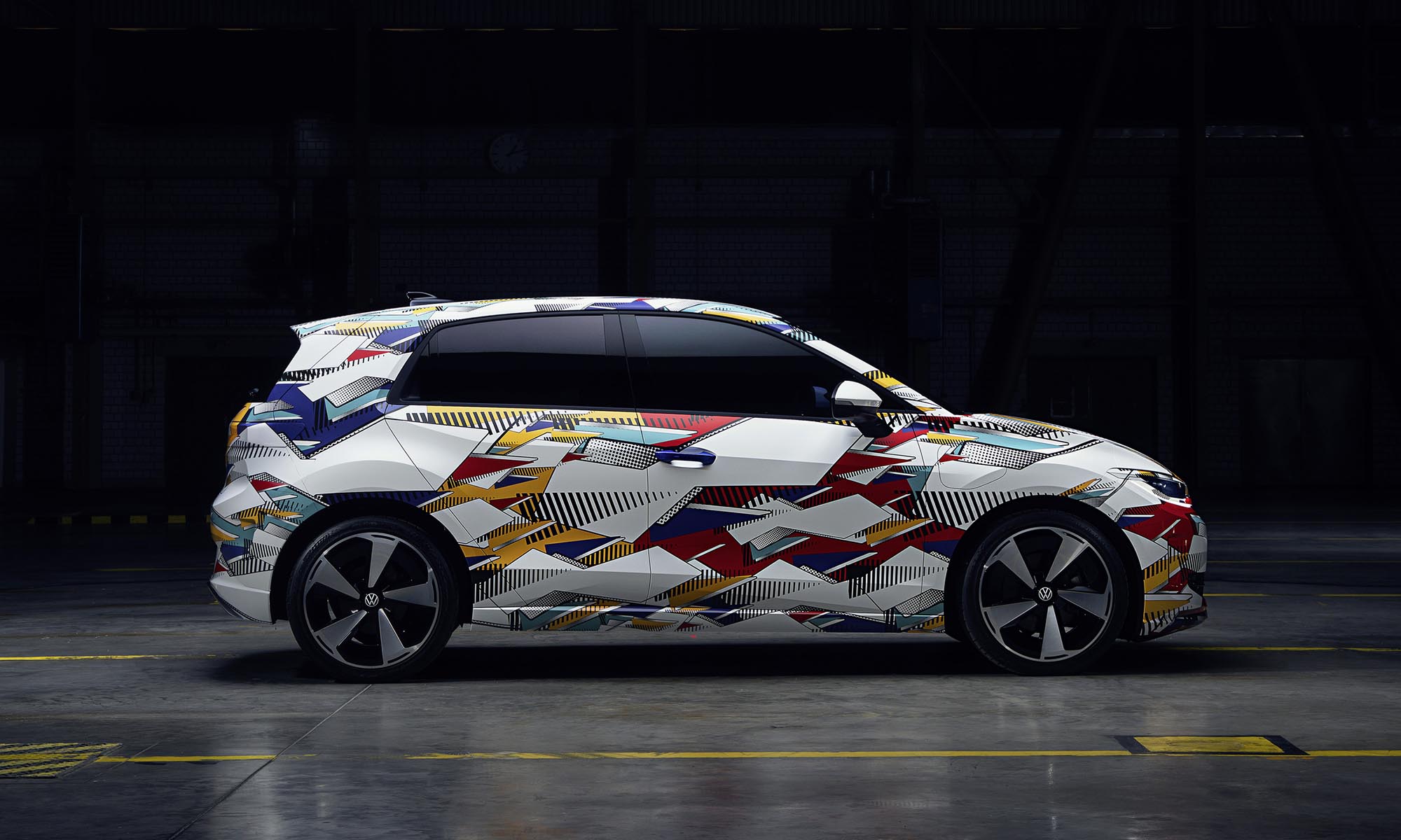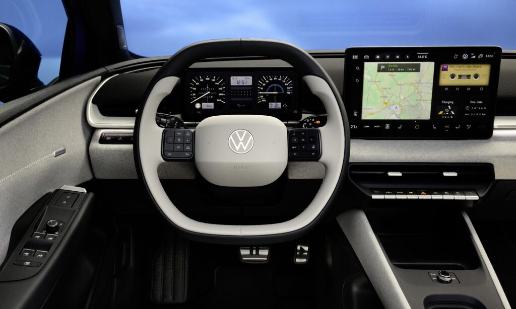 a navigáció papírtérképnek néz ki, a zene egy magnókazettán forog, a megtett kilométer és a töltöttség pedig épp olyan mutatós, mint a régi Golfokon.