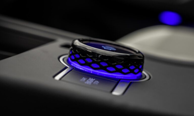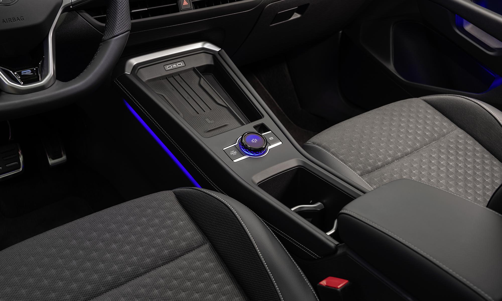 Mivel az új T-Roc már csakis automata váltós lehet, az irányváltó karja pedig az újabb Volkswagenekhez hasonlóan a kormányoszlopra került, a középkonzol aljára telefontartót tettek, ami vezeték nélkül is tölti a készüléket. Mellette pedig ott a Tiguanból és a Tayronból ismerős, látványos forgókapcsoló, benne a kis kijelzővel, ami alapesetben a hangerőt állítja, de a vezetési üzemmódok és az utastéri hangulatok közt is ezzel lehet váltani.