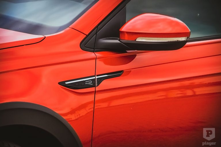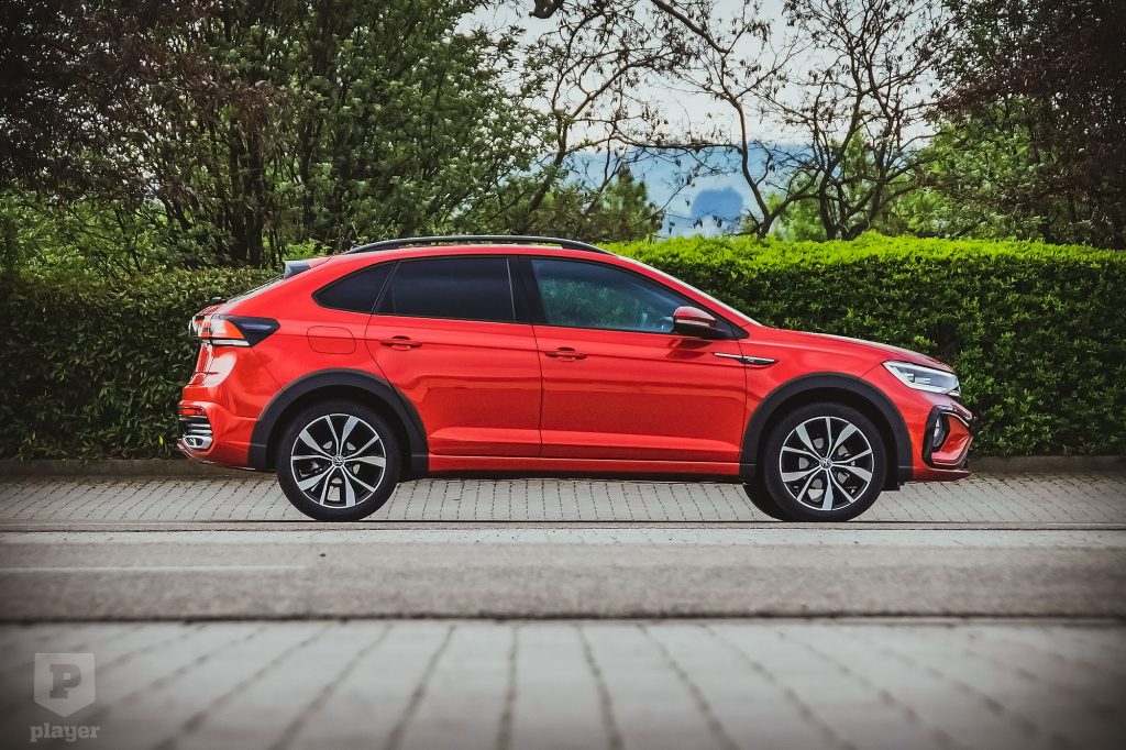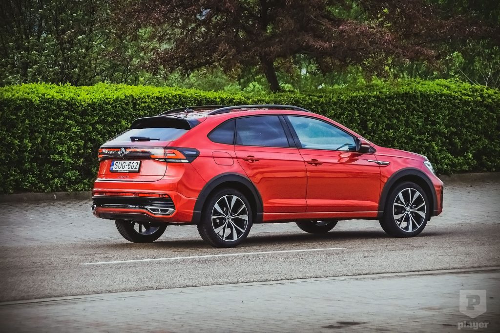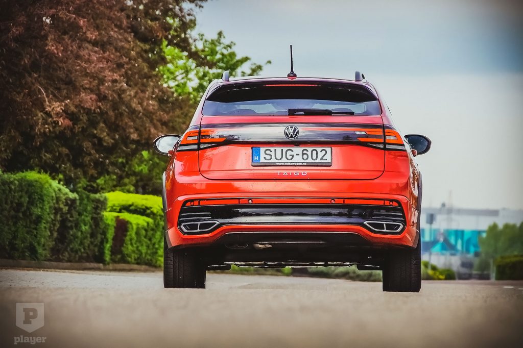 A Taigo nem is teljes szívvel, inkább csak ímmel-ámmal próbál meg úgy kinézni, mint egy SUV. Fekete sárvédőívei vannak, magas tetőkorlátok nyújtják meg kicsit optikailag felfelé, de az alapforma valójában egy erősen döntött hátfalú kis kombié. Ha most is lenne Fabia vagy Polo kombi, valami ilyesmi lenne. Az összhatás viszont egyáltalán nem rossz, főleg ebben az attraktív színben és az R-Line csúcskivitelben. A dupla kipufogóvég, az R betűs harci díszek itt-ott, a szép lámpatestek elöl-hátul ügyesen szorítják háttérbe a Taigo nem túl szerencsés arányait, így végül a keskeny-magas kiskocsi egész pofás bír lenni.