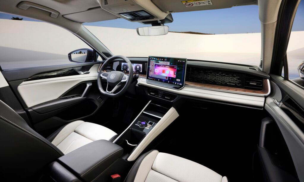 Pontosan olyan a Volkswagen Tayron műszerfala, mint a Passaté vagy a Tiguané, tehát a háromküllős kormány mögött egy digitális óracsoport van, középen pedig a mindent vezérlő érintőkijelző, mely mesterséges intelligenciával lett okosabb. Már az alapfelszereltségű Tayronban is kilenc légzsák védi az utasokat, háromzónás automata klíma temperálja a kabint és tíz színbe állható a hangulatvilágítása.
