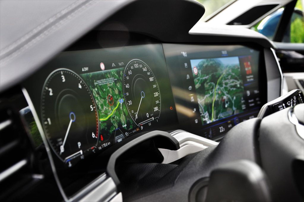 A neve Innovision Cockpit, van egy 12,3 colos színes kijelzője a kormánykerék mögött, ami a műszereket helyettesíti, és egy még nagyobb érintőképernyője a középkonzolon, ahol minden mást kezelhetsz. A képátlója 15 col, az annyi, vagy még nagyobb is, mint a laptopod, és ez azt jelenti, hogy rengeteg információ elfér rajta, nincsenek is hagyományos értelemben vett gombok.