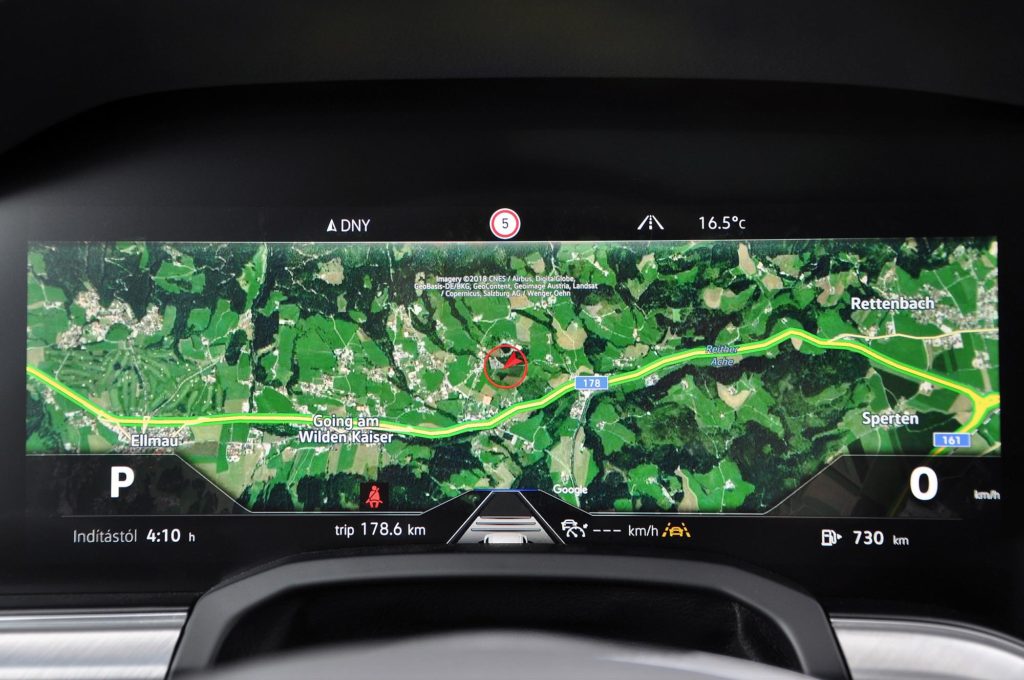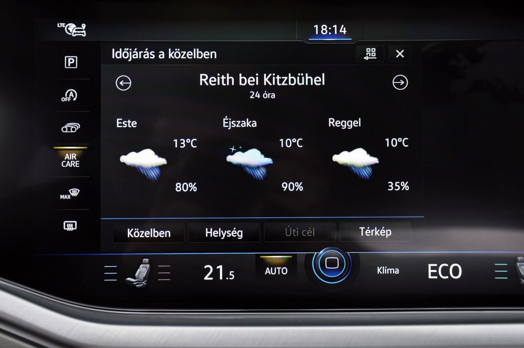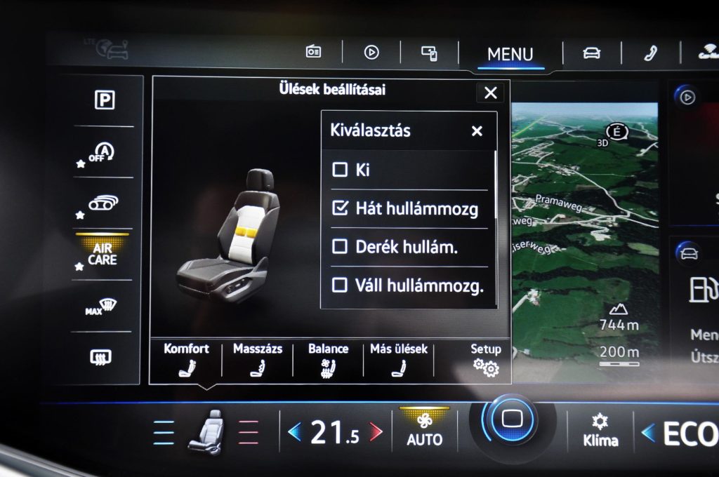 A tudása is hasonló, mivel állandó internetelérése van, ezért a térkép helyett műholdképen mutatja az utat, de lekérheted a forgalmat vagy az időjárást, és internetes rádiókat is hallgathatsz, az ausztriai menetpróbán ott volt a listában az összes magyar adó. A klímát, ülésfűtést, üléshűtést és masszázst az alsó sorból lehet kezelni, felette pedig teljesen testre szabható a nyitóképernyő.