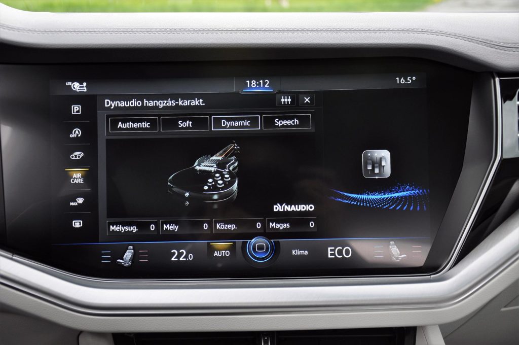Ott a head-up display, ami nem plexire, hanem a szélvédőre vetít, és a legnagyobb méretű, amit a márka valaha kínált. A panorámatető is a Volkswagen legnagyobbja, és lehet még a fedélzeten légtisztítós négyzónás klíma, és 12 hangszórós, 730 wattos Dynaudio hifi is, aminek a hangját többféle előre beállított stílussal változtathatod meg, elég meggyőző módon.