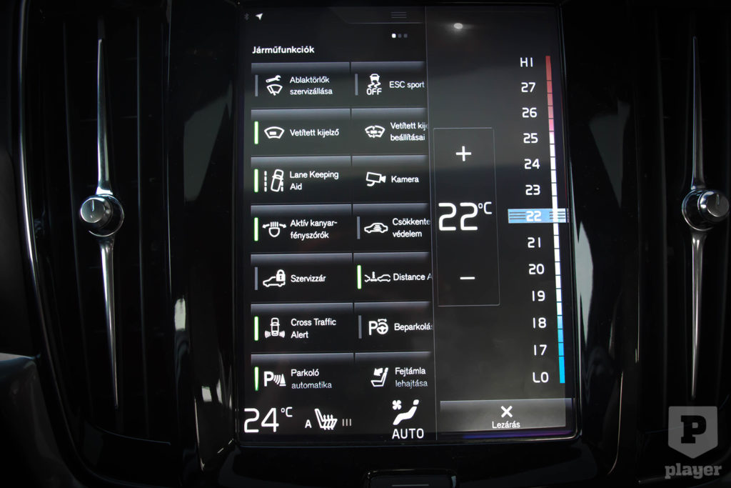 A középkonzolt már az XC90-ből jól ismerjük, teljesen rendben van, egy évvel ezelőtt zsúfoltnak hatott, mára hozzászoktunk. Autopilot ugyan nincs az autóban, de a sávtartó elektronikát (Lane Keeping Aid) tulajdonképpen értelmezhetjük így is, flipperezéssel a sávok között tartja magát az autó, inkább arra jó, aminek mondják: segít a sávban maradni, de nem tartja irányban az autót. Ez így teljesen oké, ha nem várunk többet tőle.