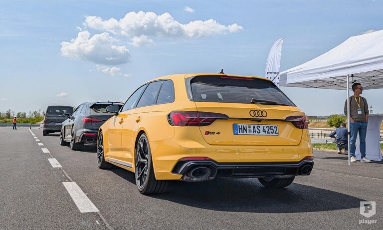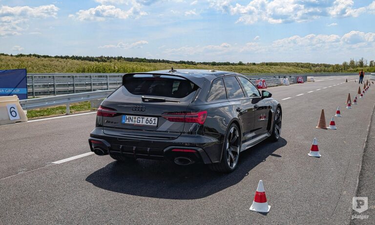 Mi ennél jóval izgalmasabb autókkal próbálhattuk ki a zalai tesztpályát. A megnyitóra két erős Audi, egy RS 4 Avant és egy RS 6 Avant érkezett, az utóbbi ráadásul a limitált szériás GT kivitel, amivel profi tesztpilóták mutatták meg, milyen élmény 250 km/órával kanyarodni. Az Audik számára nem jelentett gondot, hogy az egyenes szakasz felénél található depóból gyorsulva már a kanyarban kétszáz felett száguldjanak.