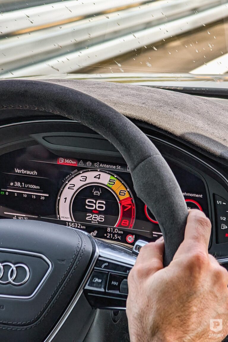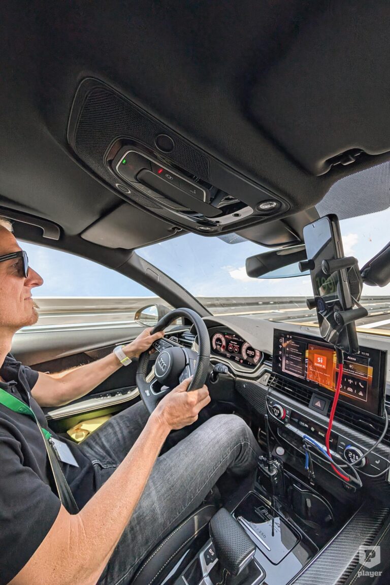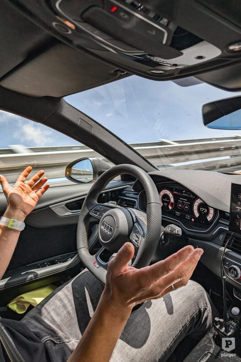 Mindeközben a tesztpilóták lazán, könnyedén vették a feladatot, nyilván ezerszer csinálták már, de azért látszott rajtuk, hogy nem tudják megunni. Míg az RS 4-ben az egyenesben és a kanyarban is állandó 250-nel mentünk, addig az RS 6-ban az egyenes végén 290 km/óráról vette el a gázt a vezető, hogy pontosan 250-nel tudjuk bevenni a kanyart.