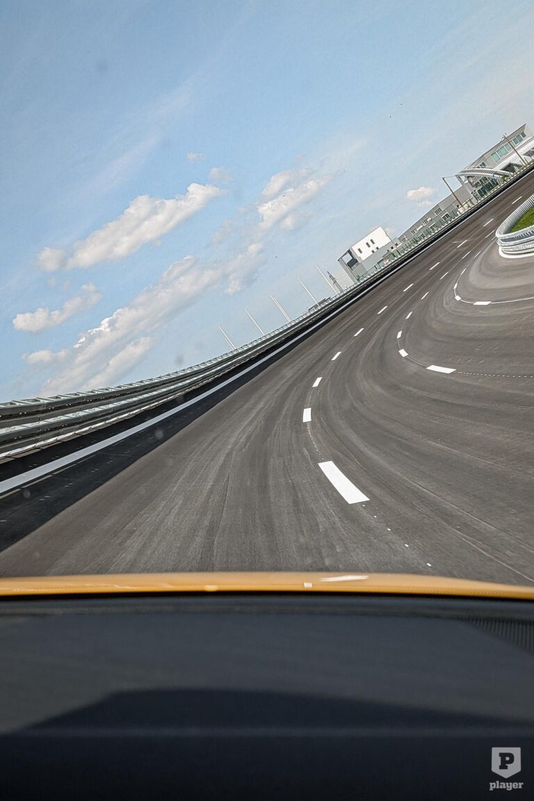 A 4,5 kilométer hosszú pálya két egy-egy kilométeres egyenes részből, és két parabolakanyarból áll. A felső része 47 fokban döntött, és amikor az építése kapcsán itt jártunk, akkor kiderült, hogy gyalog csak a feléig jutunk anélkül, hogy négykézláb kellene kapaszkodnunk. Pontosan ez a dőlés teszi lehetővé, hogy 250 km/órával gond nélkül kanyarodjon a jármű, ráadásul