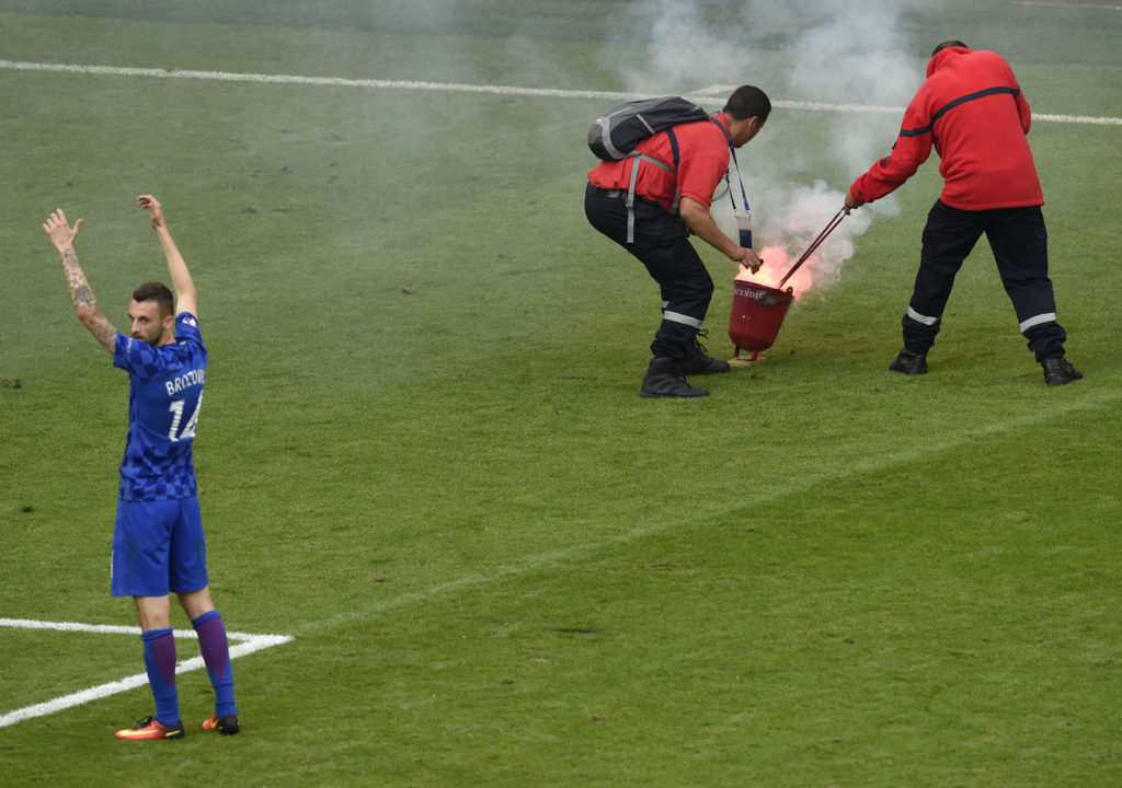 Ez volt az a pont, amikor horvát tábor elé látszólag ok nélkül rendőrsorfalat vezényeltek. A szurkolóknak ez a két dolog egyszerre már túl sok volt és előbb tűzijátékokat dobáltak a pályára, majd egy petárda is robbant, végül pedig elkezdték egymást verni. A játék persze állt, de szerencsére a biztonsági emberek biztonságban voltak, nem nagyon mertek bemenni rendet tenni a táborba, viszont egy tűzoltó/pályamunkás könnyebben megsérült.