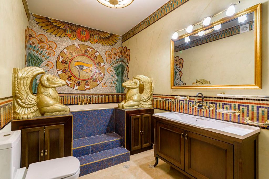 A fehér márvány padlótól és a falakat szegélyező oszlopoktól kezdve az egyiptomi mitológia által ihletett szobrokig és bútorok díszítéséig a lakásban minden Egyiptomot idézi.