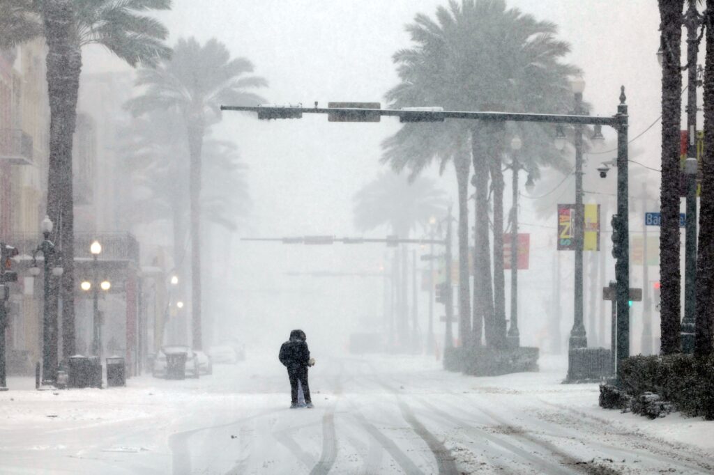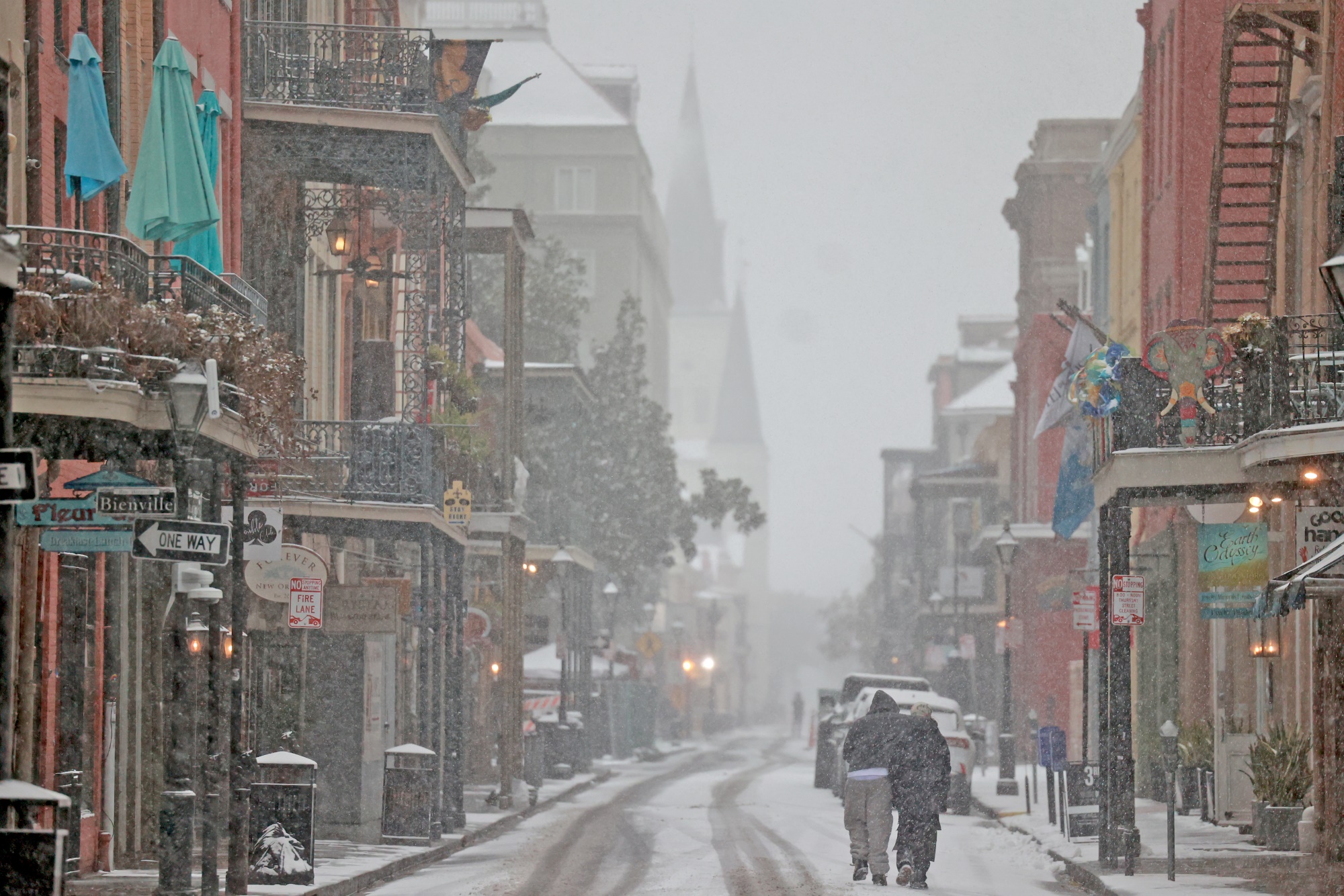 És New Orleans sem a síelésről és a hógolyózásról ismert, márpedig az ismert főutcáján, a Bourbon Streeten lehetett sílécekkel közlekedni, és zajlik a hógolyócsata is.