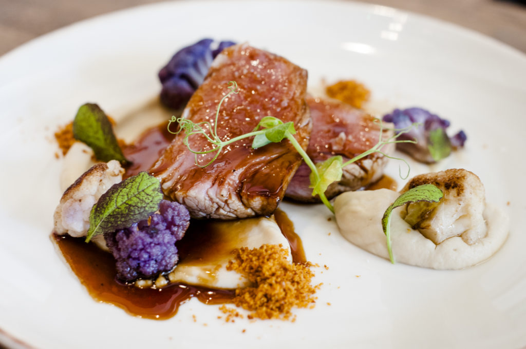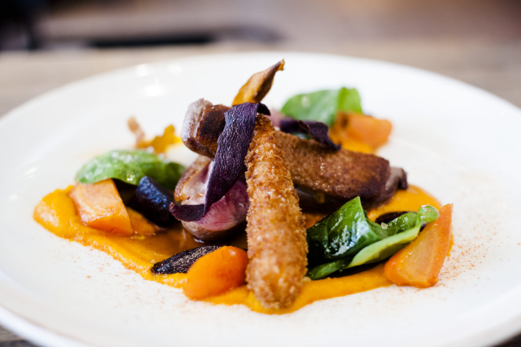 A nehézfegyverzet egyik legerősebb darabja a kacsamell, ami mellé a répa négyféle állagban érkezik: por formában, püréként, chipsként és lepárolt répaként. A kacsamell szuvidált, az egész együtt pedig olyan, mint egy remek gasztró-ensemble, olyan minden érzéket megbizsergető muzsika, amire az ember nem számít a Gozsduban.