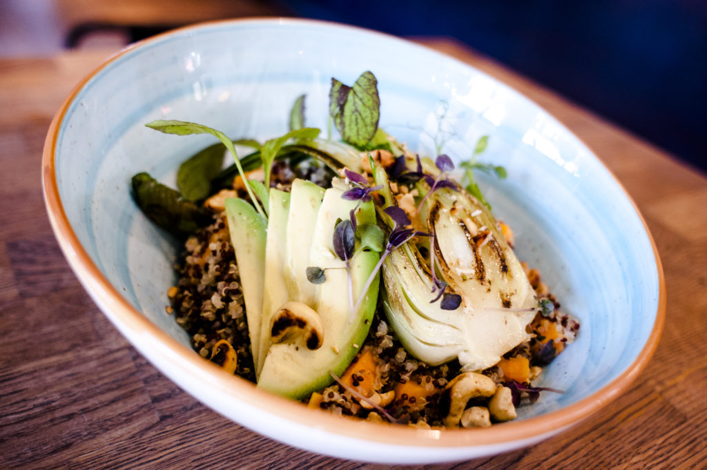 Éles szeműeknek feltűnhetett, hogy eddig húsnehéz fogásokat említettünk, de a 4BRO természetesen a vegetáriánusokra is gondol. Ennek ékes bizonyítéka egy igazi superfood, a kókusztejben főzött quinoa édesburgonyával, kínai kellel, avokádóval és pirított kesudióval. Annyira rostgazdag, hogy valószínűleg nincs az a radikális egészségsznob, aki ne csettintene elismerősen.