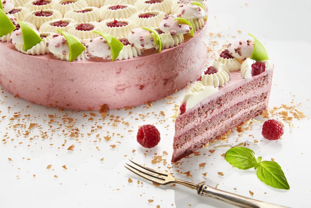 Roppanós réteg, málnás áztatóval átitatott piskóta, málnás-fehércsokoládés krém, citromos-bazsalikomos felvert ganache, málna lekvár és málnás meringue alkotják a tortát. A csipkét a torta tetején a citromos, bazsalikomos felvert ganache idézi, melyek közeit málna lekvár tölti ki. Liofilizált málnadarabokkal megszórt meringue-gekkel és zöldre színezett fehércsokoládé lapkákkal díszítjük