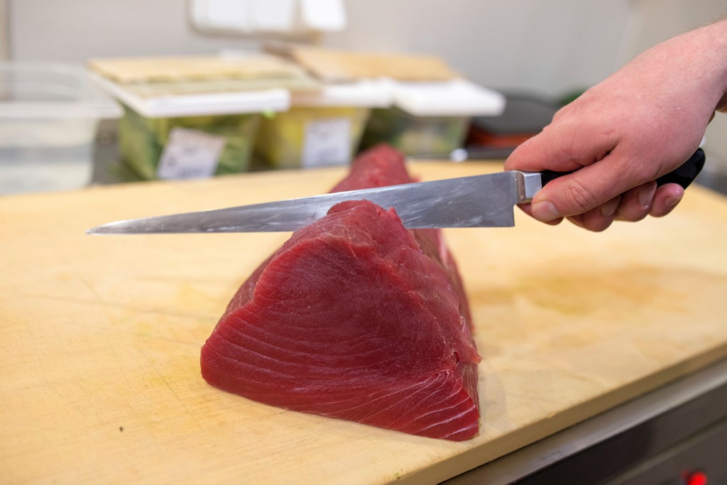 Az étlap a napokban újult meg, főleg ennek a tételeiből kaphattunk bőséges kóstolót. Levente kiemelte, hogy náluk, minden frissen, rendelésre készül, és semmi sincsen előre bedobozolva. Ez azért is nagy szó, mivel házhozszállításra is dolgoznak, valamint a napokban indul el a webshopjuk is, ahonnan válogatásokat lehet rendelni. Pont amikor ott voltunk, érkezett be egy minimum négykilós, óriási vörös tonhal, ami rögtön feldolgozásra is került, és, hát mit mondjak, eléggé szerettük a kés alól leeső kis darabokat kóstolgatni.