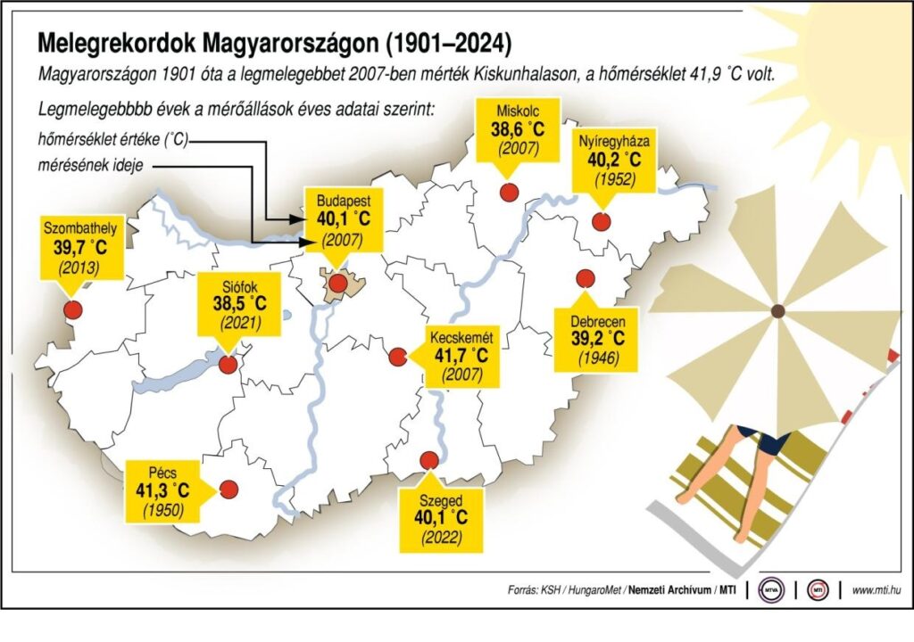 A meteorológiai szolgálat az idei nyár rekordjairól közölte, hogy a legmagasabb nappali hőmérsékletet július 26-án a Békés vármegyei Sarkadon mérték, 41,3 fokot, a nyár legalacsonyabb hőmérsékletét pedig a Nógrád vármegyei Zabarban és a Borsod-Abaúj-Zemplén vármegyei Lénárddarócon, augusztus 25-én, 1,7 fokot.