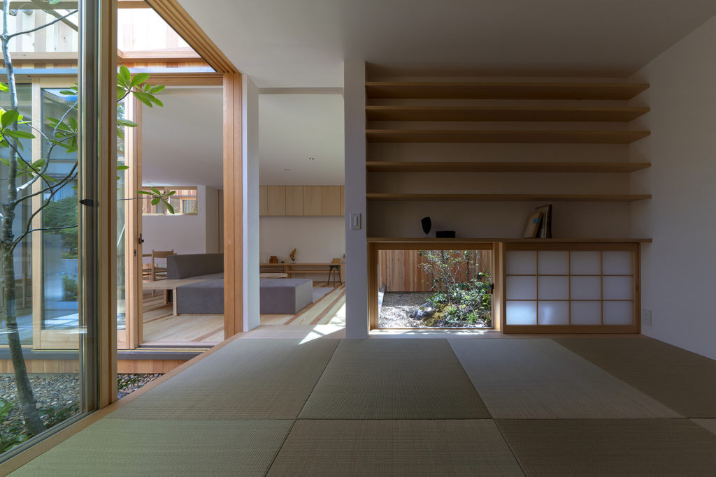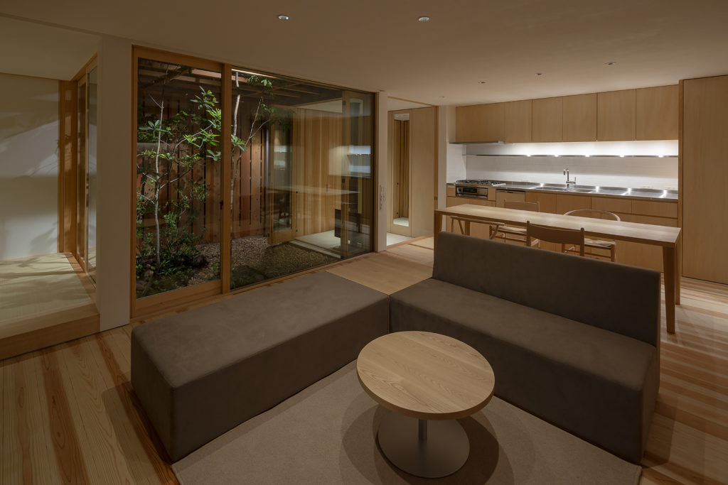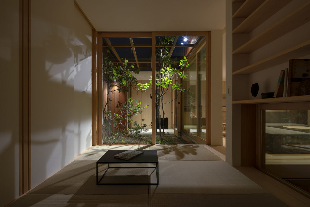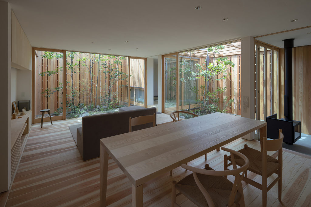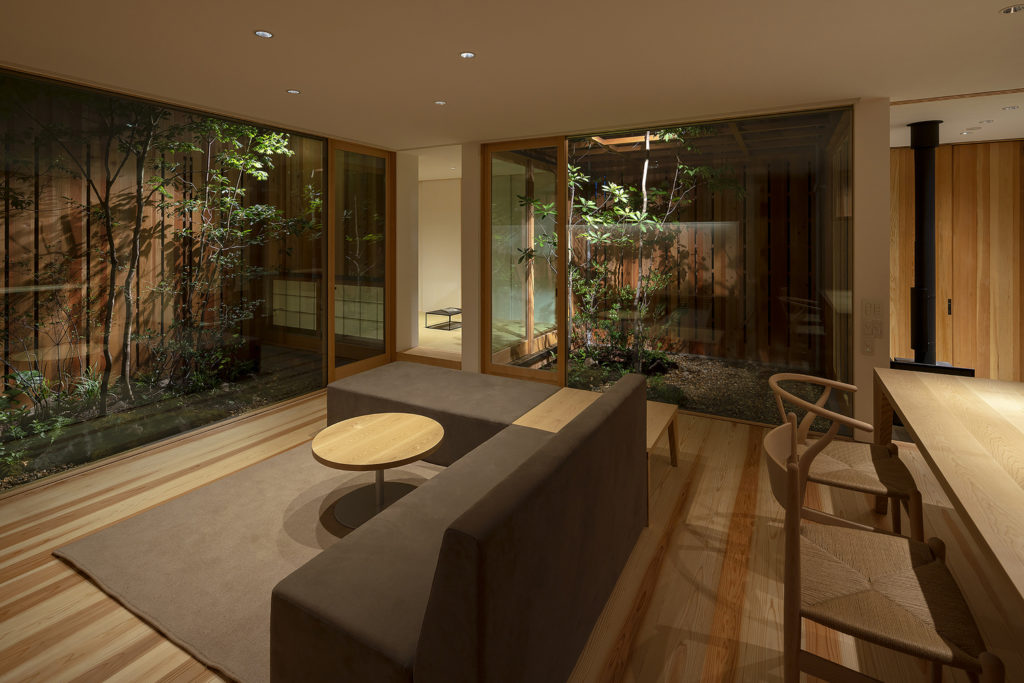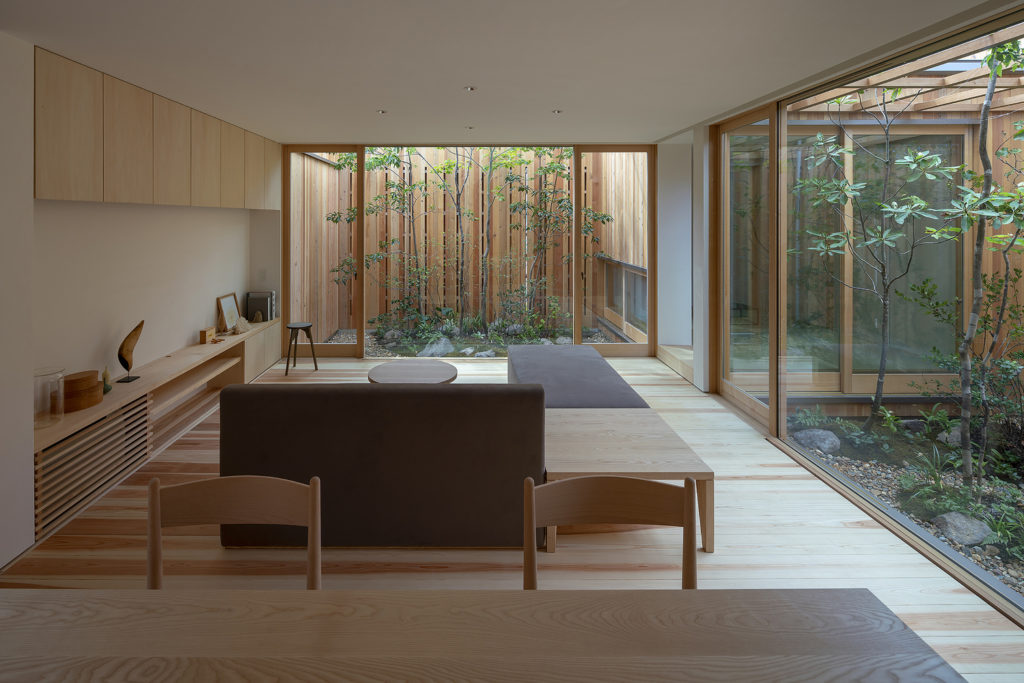 A fa- és üvegdomináns, napfényes ház elég apró, csupán 81 négyzetméter, de minden centije rendben van. Három apró, fás és köves udvar veszi körül az épületet (és tűnik fel a közepén) a harmonikus keleti stílus égisze alatt. Szeretjük.
