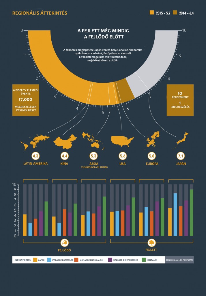 A vállalati vezetők bizalmi szintje – és négy további tényező – alapján kialakuló Fidelity Globális Hangulati Indexe a 2014-es 6,4 pontról kissé visszaesett, és jelenleg 5,7 ponton áll. A felmérés a regionális differenciálódás mértékének növekedésére is rámutatott; a fejlődő piacok érték el a legmagasabb pontszámot – az élen Japán végzett (7,1 pont), utána Európa (5,8 pont) és az Egyesült Államok (5,6 pont) következtek.