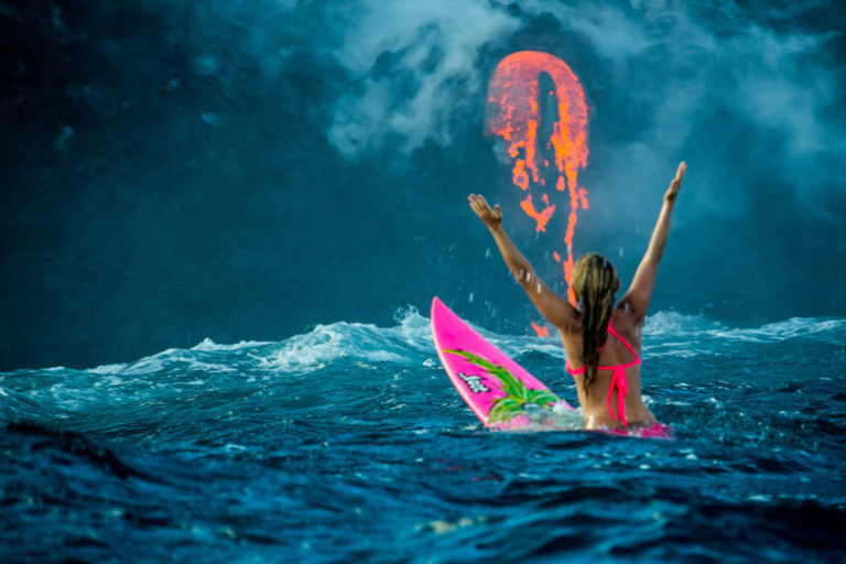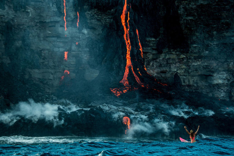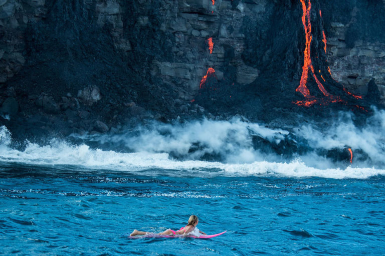 Elison ikonikus pink szörfdeszkájával járja a világot és minden útját megörökíti. Megjárta már a nagy csendes-óceáni szemétszigetet is, ez a képsorozat pedig Hawaii-nál készült, ahol a Kilauea vulkán kitörését nézte végig a vízről, a deszkáján ülve.