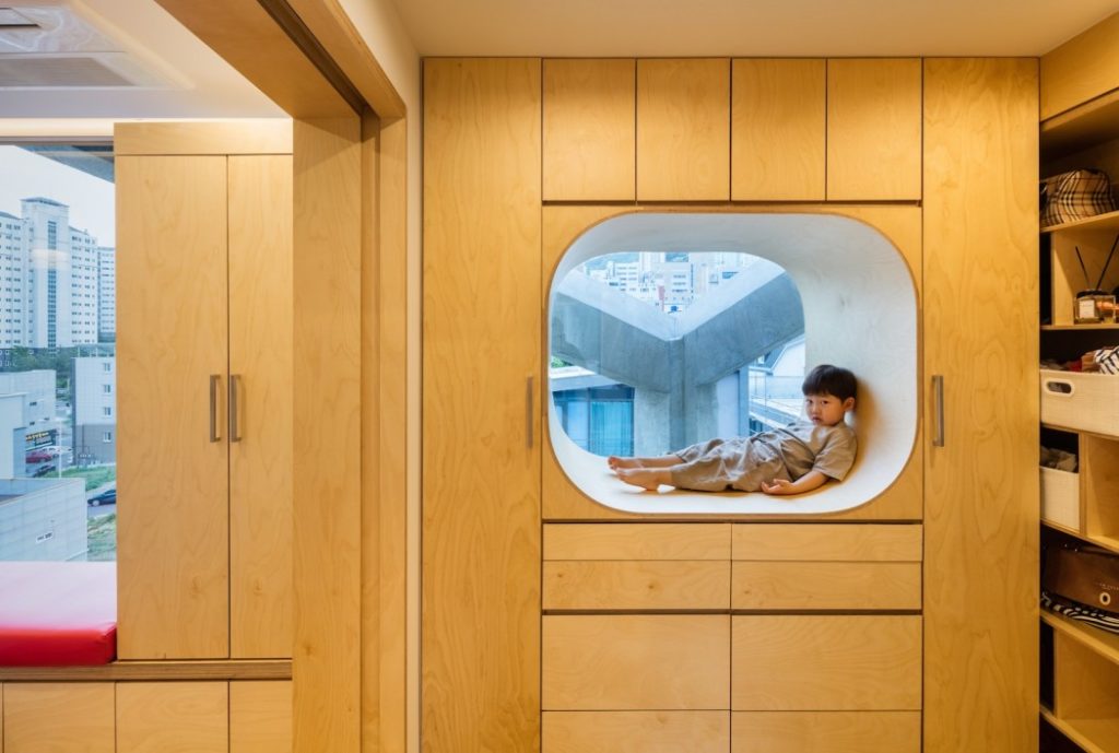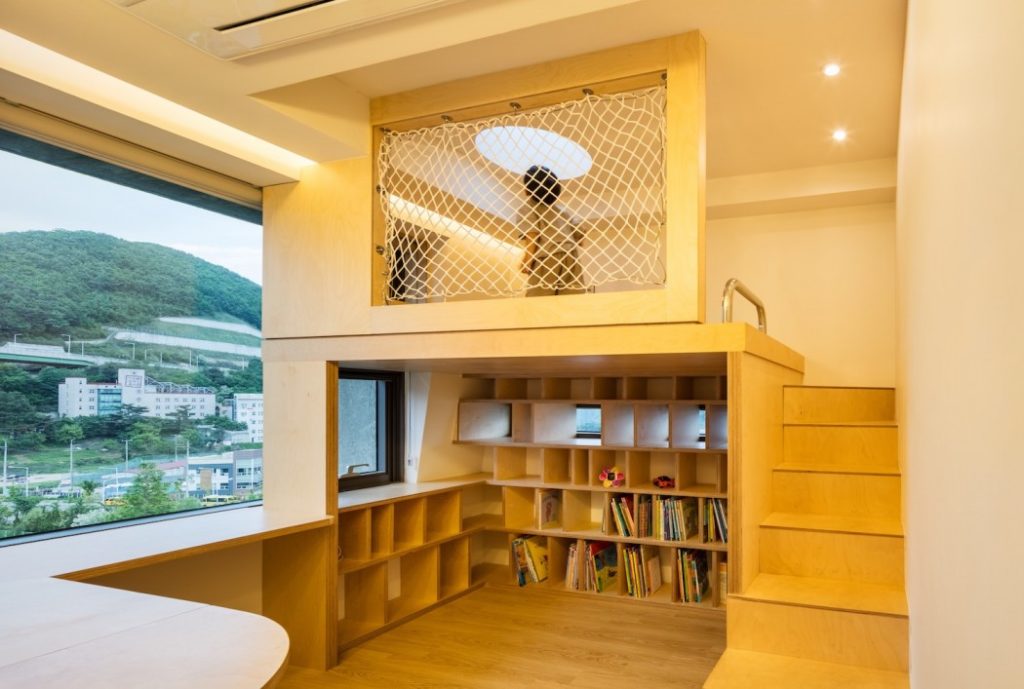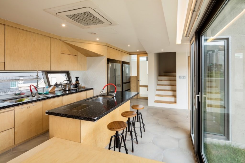 A dél-koreai építészt, Moon Hoont bízták meg, hogy építse meg ezt a három szintes épületet egy család számára. Az apuka biztonsági őrként dolgozik, talán ezért akarta, hogy minden oldalon legyen ablak és figyelhesse a környéket, ki tudja, mindenesetre a 116 négyzetméteres házat tán nem véletlenül hívják a környékbeliek bagolyháznak.