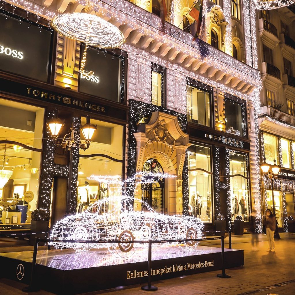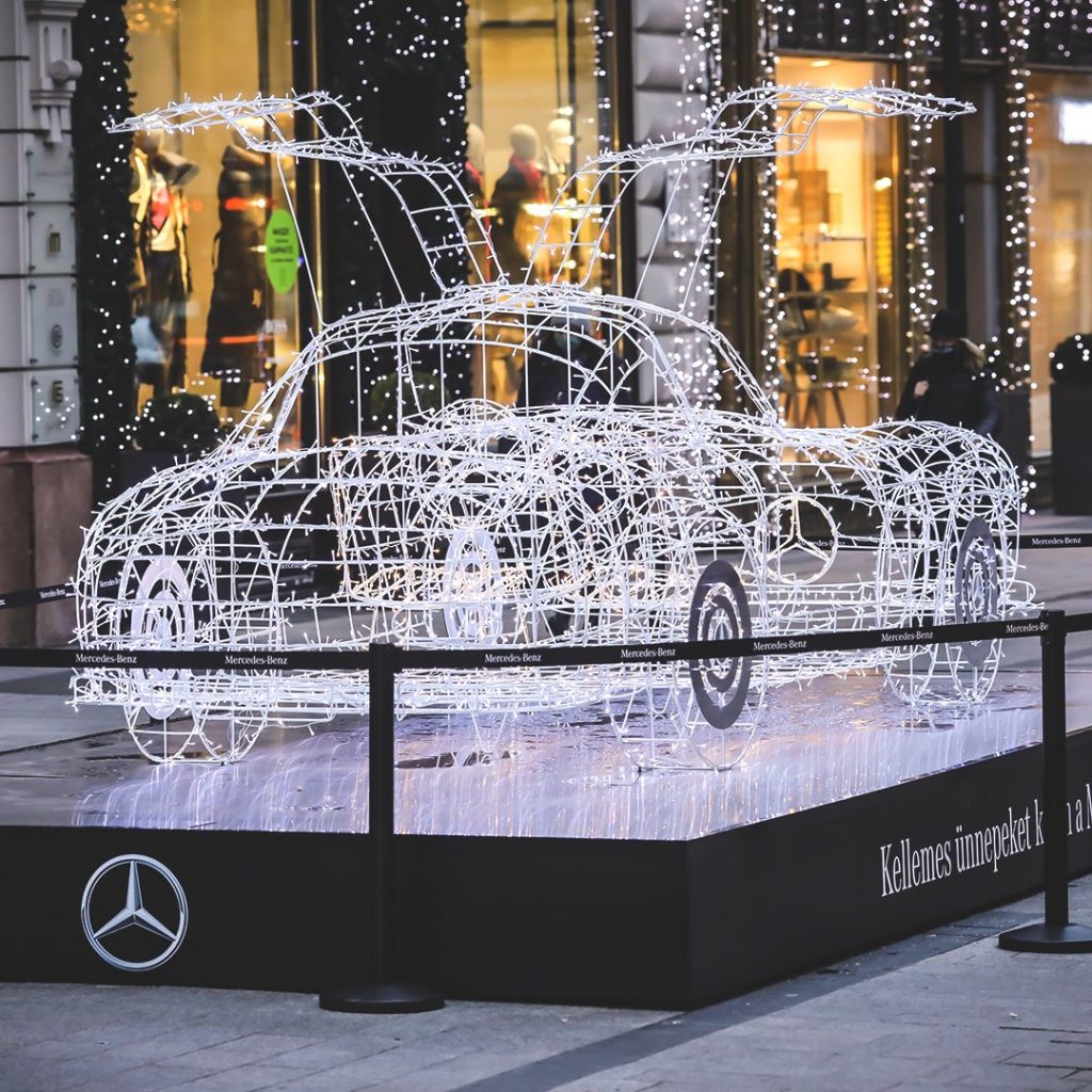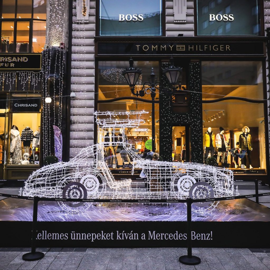 A Mercedes minden évben előrukkol egy különleges adventi dekorációval Budapesten, és idén a legendás 300 SL sziluettjét alkották meg karácsonyi fényekből.