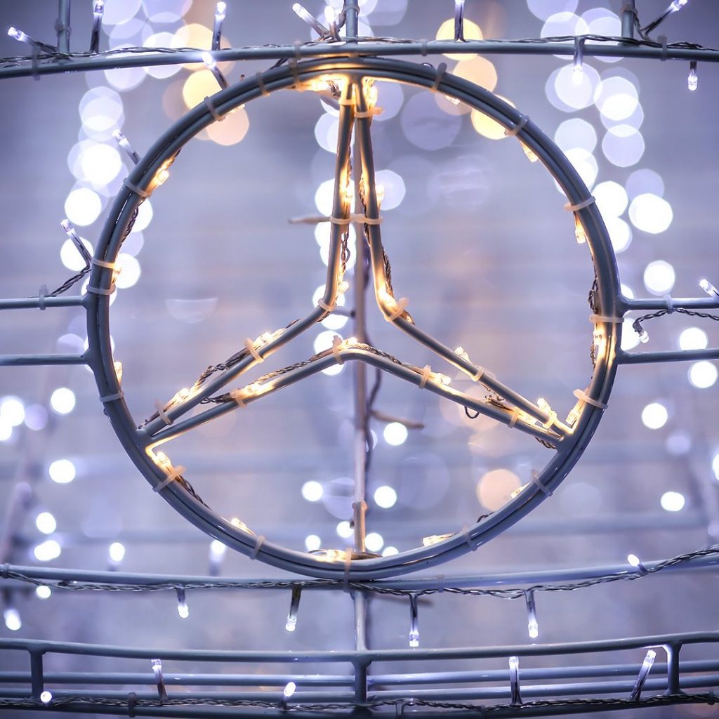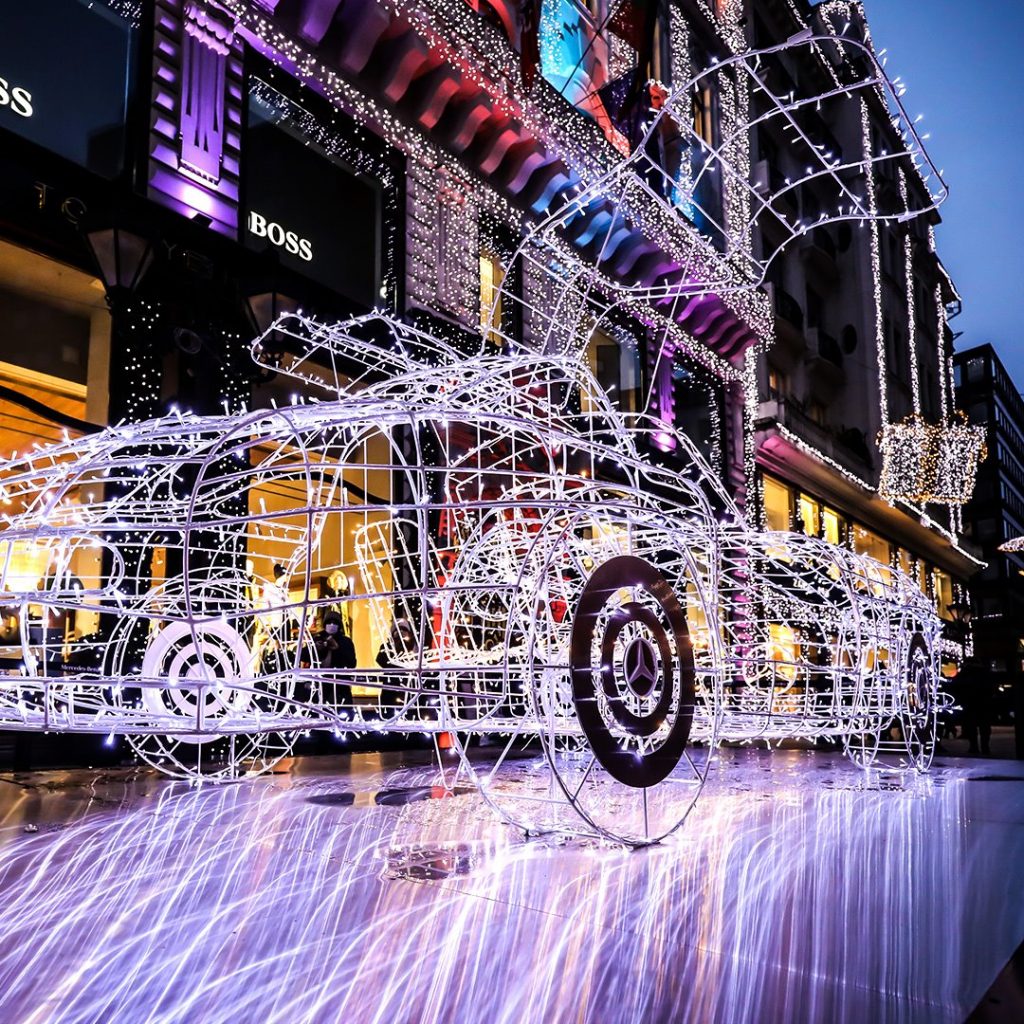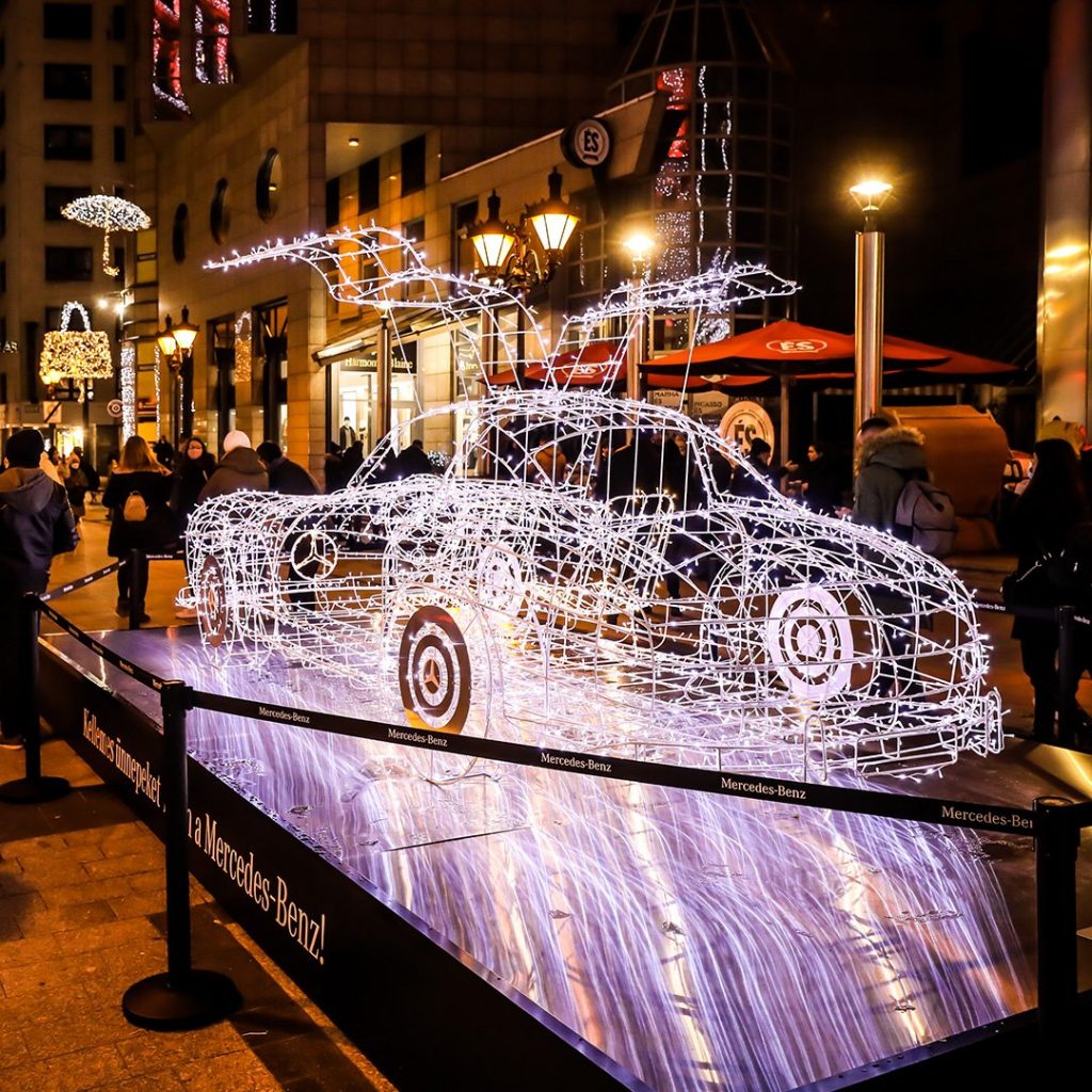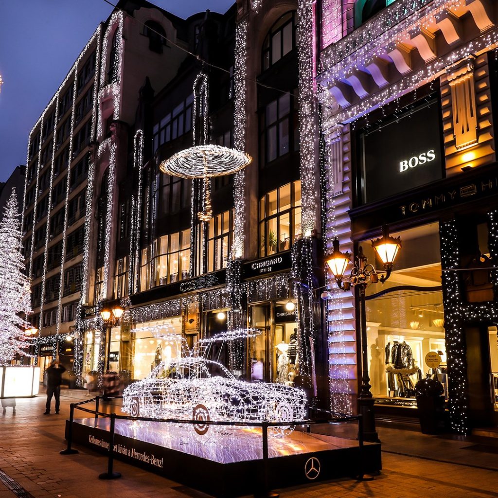 A Mercedes minden évben előrukkol egy különleges adventi dekorációval Budapesten, és idén a legendás 300 SL sziluettjét alkották meg karácsonyi fényekből.