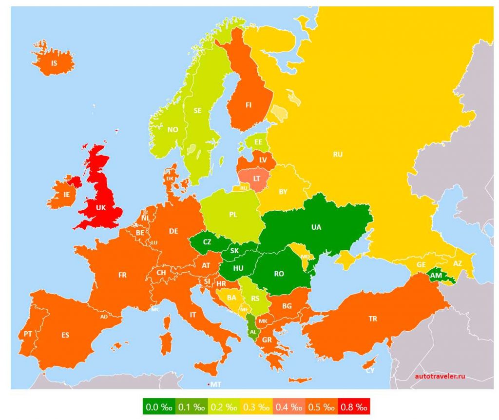 Az alkoholfogyasztás és a járművezetés között világ számos országában létezik a mi szabályozásunknál lazább kapcsolat. Persze nem nyakló nélkül mehet az iszik-és-vezet: általában maximum 0,5-0,8 véralkohol-ezrelék az a határ, amit az ittas vezetésre vonatkozóan a törvény ezekben az államokban meghatároz. Még az EU-n belül sem egységes a szabályozás: Ausztriában 0,5‰, de friss jogsisoknak csak 0,1‰ a megengedett, Nagy-Britanniában Anglia és Wales 0,8, de Skócia 0,5‰ értéket határozott meg, Szlovéniában, Belgiumban 0,5‰ az elvi határ.