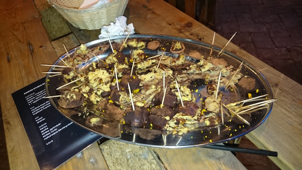 Mire ezzel végzünk, már bárki lelkiismeret-furdalás nélkül nekieshet a svédasztalnak, úgyhogy a népek begyűlnek az asztalok köré. Néhányan elkezdik ipari mennyiségben gyártani az instázható képeket az előtérbe kihelyezett adisasos fal előtt, mi pedig odaragadunk a pult mellé Irsai Olivérrel barátkozni. Miközben a kijelzőkön végtelenítve pörögnek a Tubular promók, néhány kollégának láthatóan elkezd a mozgáskoordinációjára menni az elfogyasztott alkohol. Egy szakállas, übertrendi neo-hipszter koma rányomul a hugira, én pedig csalódottan veszem tudomásul, hogy valaki egészen konkrétan szétnyomkodott egy egész tálcát abból a fasírtnak tűnő kajából, amit én még mindenképpen meg akartam kóstolni.