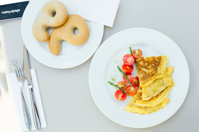 A mediterrán reggeli (1190 Ft) egy kis tálka jól elkészített humuszt és egy remek összetételű padlizsánkrémet takart, ami mellé zeller, uborka, paradicsom és retek érkezett kísérőnek. Az akvárium logóját formázó zsömle (kifli, vagy bármi is az) gegnek jó, de elég keményre sütötték. Lehet, hogy ez csak arra a két darabra vonatkozott, és persze az is lehet, hogy ez a ropogósság mást tökéletesen boldoggá tett volna. Az apróra vágott zöldségekből és egy kifliből nem derül ki, mit tud egy hely, de a padlizsánkrém igazi szívvel-lélekkel elkészített darab volt, szinte egy molekulányi sem maradt a kis tálkában.