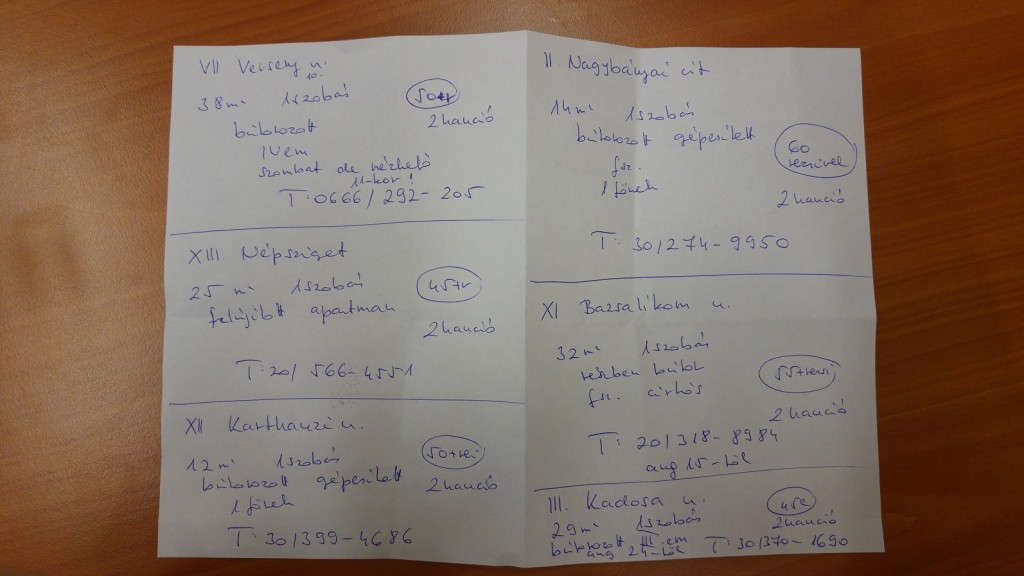 Csak éppen nem is az, amiben az utolsó szalmaszálként a címközvetítő irodához forduló ügyfelek reménykednek. Én például a pénz kifizetése után kaptam egy hét címből álló, kézzel írt listát, tele olyan kiadó lakások címeivel, amelyek többsége hetek óta fent volt a különböző ingatlankereső oldalakon, mellé pedig egy freemailes e-mail fiók belépési jelszavát, ahova naponta érkeznek a friss hirdetések.