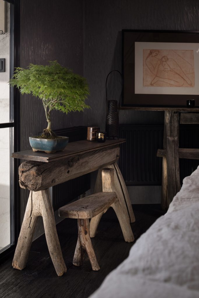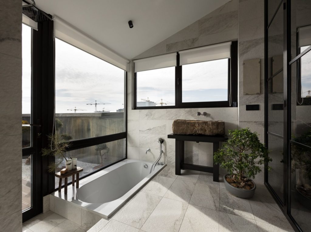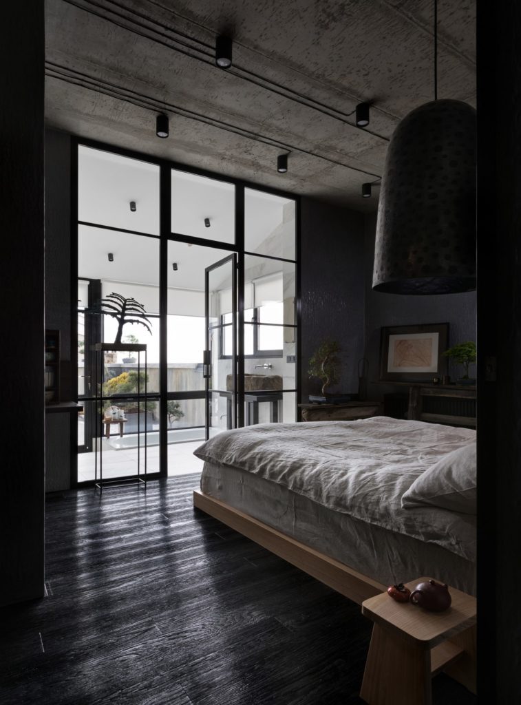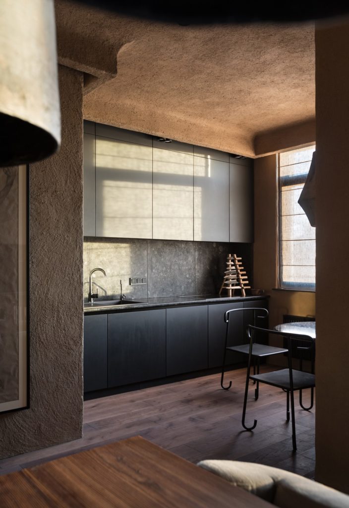 Míg a színpaletta, a bonszai-ok, a kis kőkert és a bútorok esztétikája kifejezetten japán minimalista virtust mutat, addig a nyers textúrák, fémlépcsők, számos dizájnelem és üvegmegoldás a modern ukrán belsőépítészeti csapásvonalat járja. A kettő közt csodás híd ez a kijevi, 175 négyzetméteres lakás, amelynek tulajdonosa szerint a tranzisztenciára, a tökéletlenségre és a természetességre építő wabi-sabi buddhista filozófia adja a lelkét.
