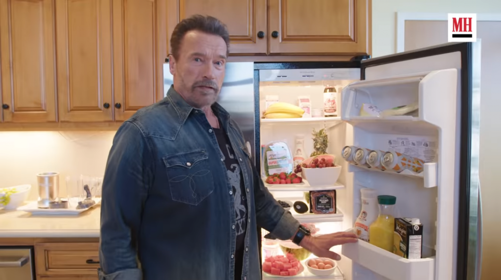 Schwarzi hűtőjében főleg zöldségek és gyümölcsök találhatók, az egyik kedvence pedig a görögdinnye, amelyből előre felvágott adagban ott sorakozik egy egész arnoldnyi mennyiség. Van ott radler is, a mester egyik kedvenc itala, amely ugye világos sör és szénsavas limonádé keveréke.