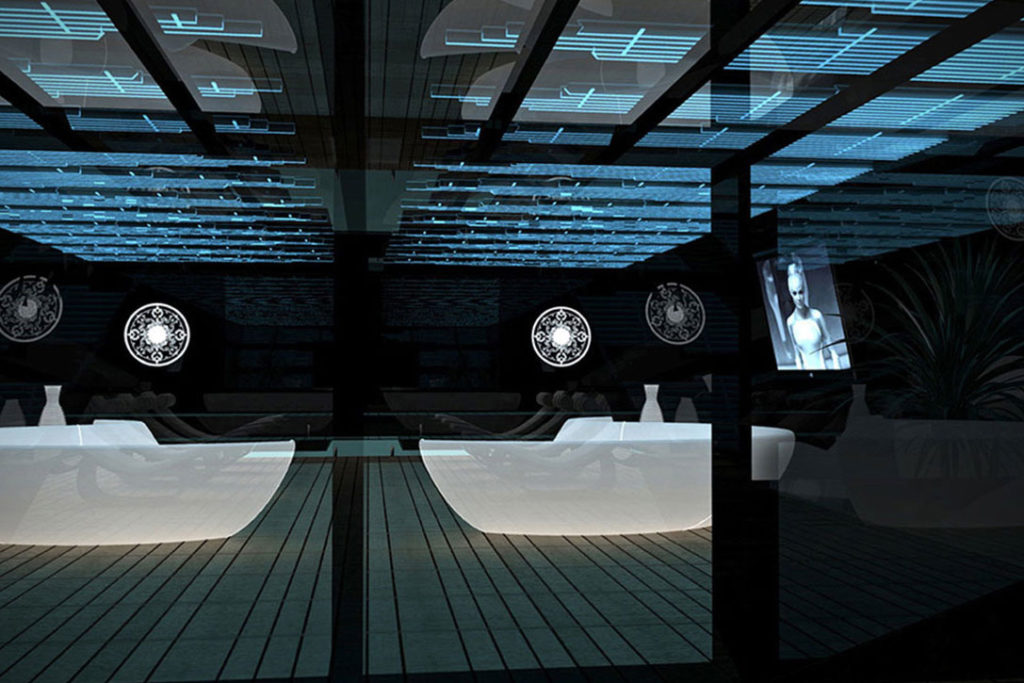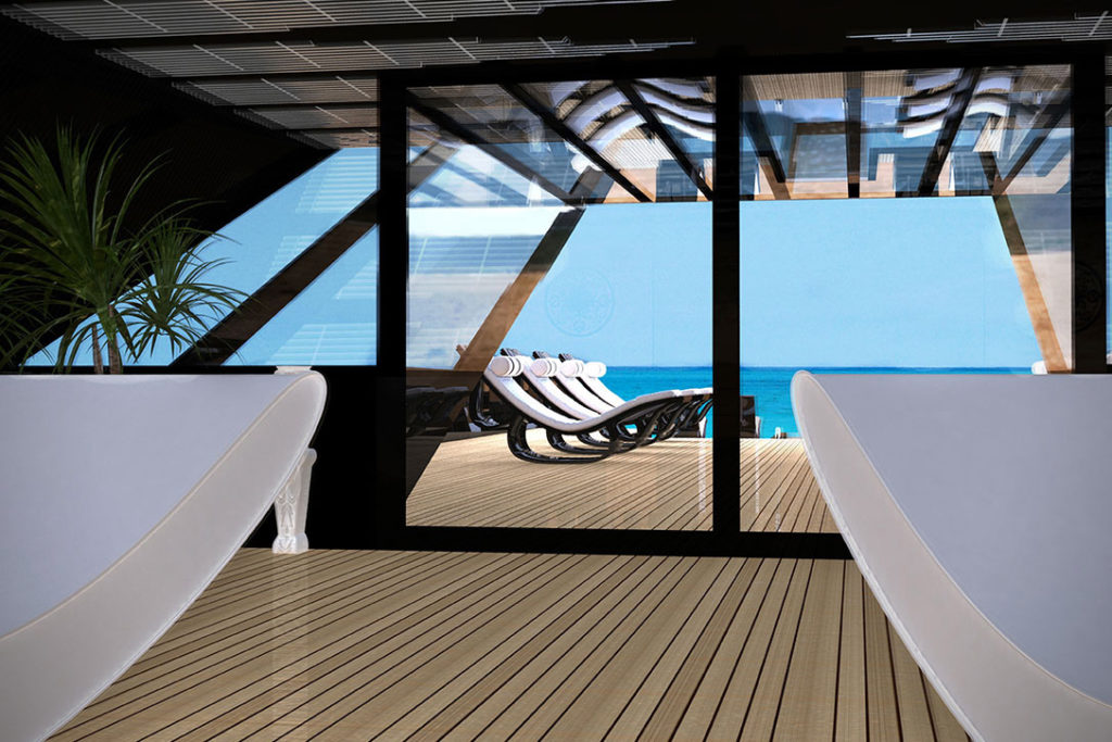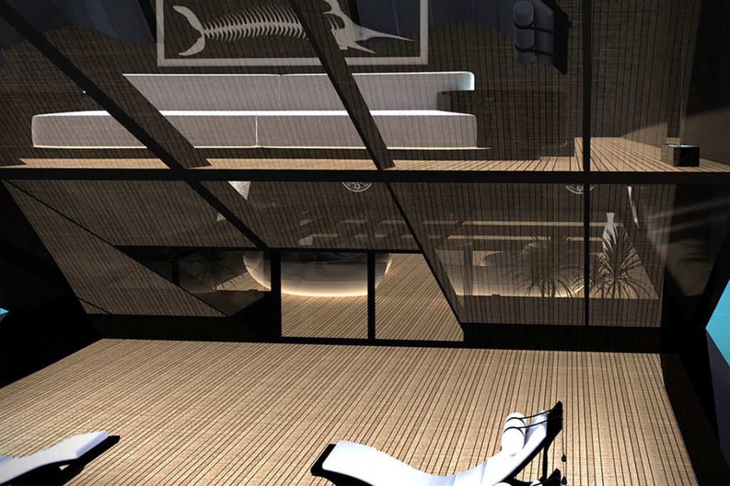 A felső fedélzeten helikopter-leszállópálya (ide egy titkos liften lehet feljutni), óriási medence és egy komplett napozóterasz és standklub is elfért.