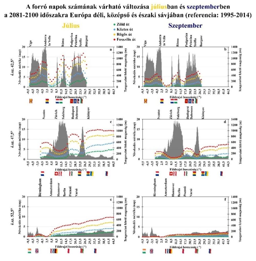 Az ELTE kutatói három szélességi kör mentén vizsgálták a melegedés mértékét négy különböző üvegházgáz-kibocsátási forgatókönyv alapján. Ezek közül az optimista „zöld út” (SSP1-2.6) azonnali kibocsátáscsökkentést és alkalmazkodást feltételez, amely mellett a felmelegedés mértéke mérsékelhető, így a 35 °C feletti maximumhőmérsékletű napok száma csak enyhe növekedést mutatna. A legpesszimistább „fosszilis út” (SSP5-8.5) ezzel szemben abból indul ki, hogy a fosszilis energiahordozók jelenlegi ütemű használata folytatódik a század végéig.