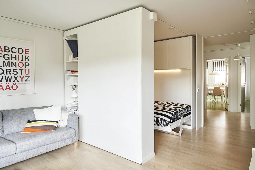 Mivel egyetlen, kitolható falban egyszerre lehajtható ágy, íróasztal, szekrénysor és tárolóegység is!