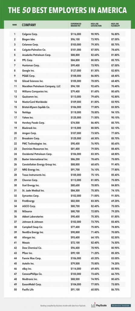 A PayScale és a Business Insider felmérésében a fizetés mellett többek között a munkahelyi stressz mértékét és a munkaidő rugalmasságát is vizsgálták, és ez alapján rendezték sorrendbe, hogy a 2012-es Fortune 500 cégei közül melyik az ötven legjobb munkaadó.